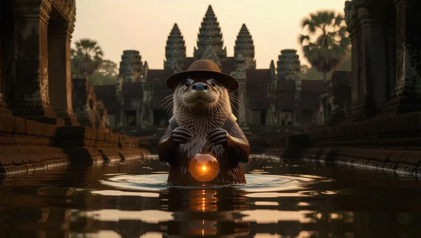 An audacious otter swims through the ancient ruins of Angkor Wat in Cambodia, carrying a mystical orb in its paws. The otter dons a tiny hat and a bag strapped across its body. All around, elaborate stone figures and towering edifices rise from the jungle, their surfaces enshrouded in moss and water plants. As dusk approaches, the ruins and dense foliage are illuminated with a soft, orange hue. The air is thick with the scent of earth and ancient secrets.