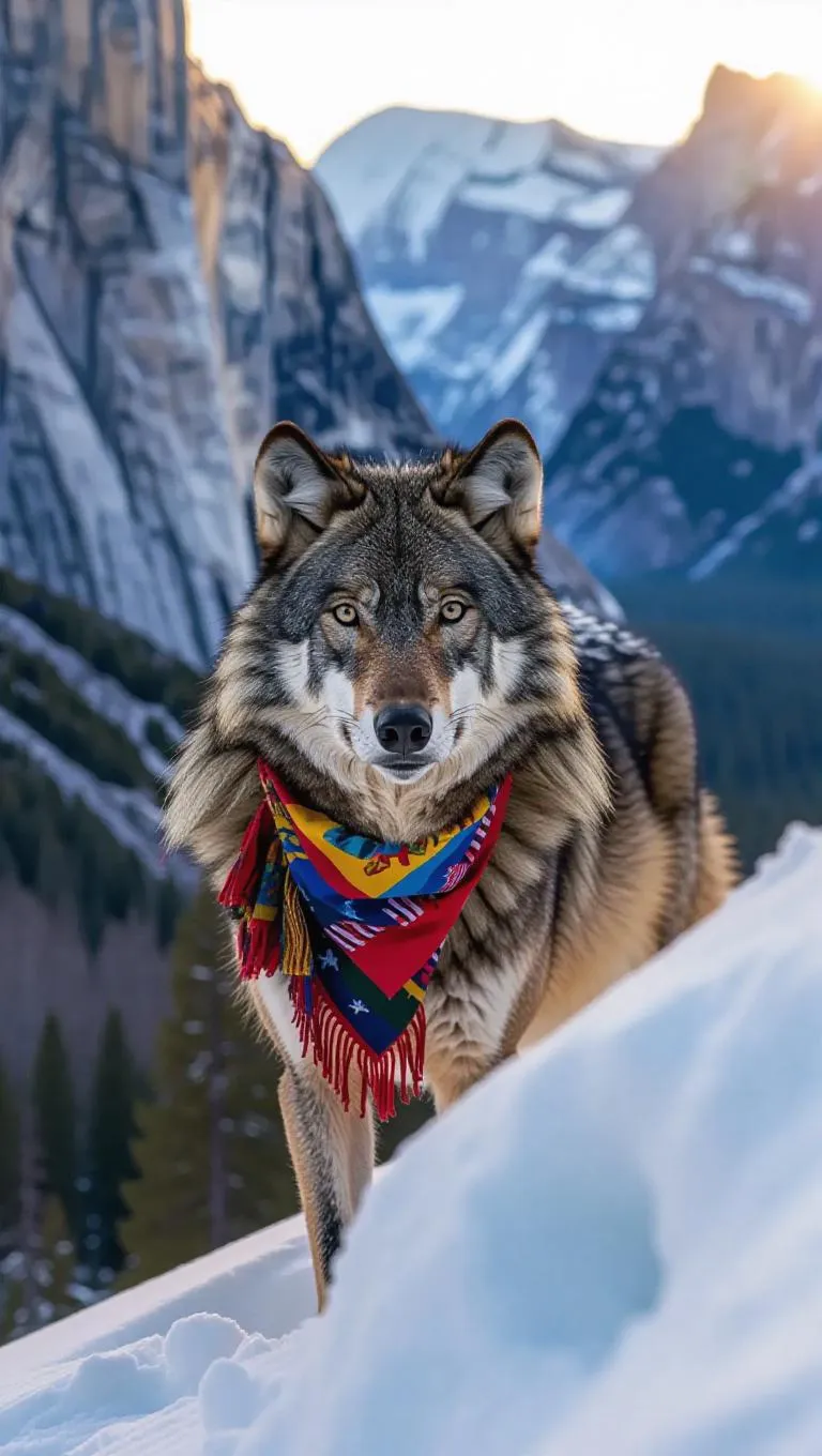 A courageous wolf wanders across the steep cliffs of the Sierra Nevada, USA, its paws making soft imprints in the white snow. The wolf dons a heavy fur cloak and a colorful bandana tied around its neck, its breath visible against the frosty air. Surrounding it, tall cliffs and snowfields stretch towards the horizon, their textures shimmering in the midday light. Far off, a shimmering river reflects the golden sunset, its flow gentle and peaceful. The air is invigorating and redolent of spruce.