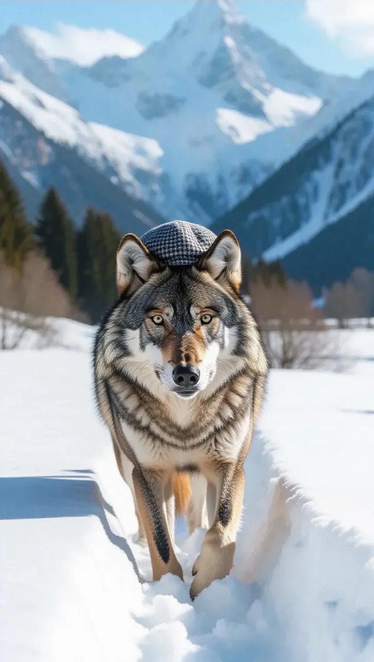 A resilient wolf roams the alpine fields of the Swiss Alps, its paws breaking through the powdery snow. The wolf wears a soft fur vest and a playful cap, its breath forming clouds in the chilly surroundings. In the background, majestic mountains and frozen lakes rise prominently, their surfaces reflecting the sunlight. Not far away, a whispering brook reflects the vast blue, its waters tranquil and soothing. The atmosphere is refreshing and carries a hint of earthy pine.