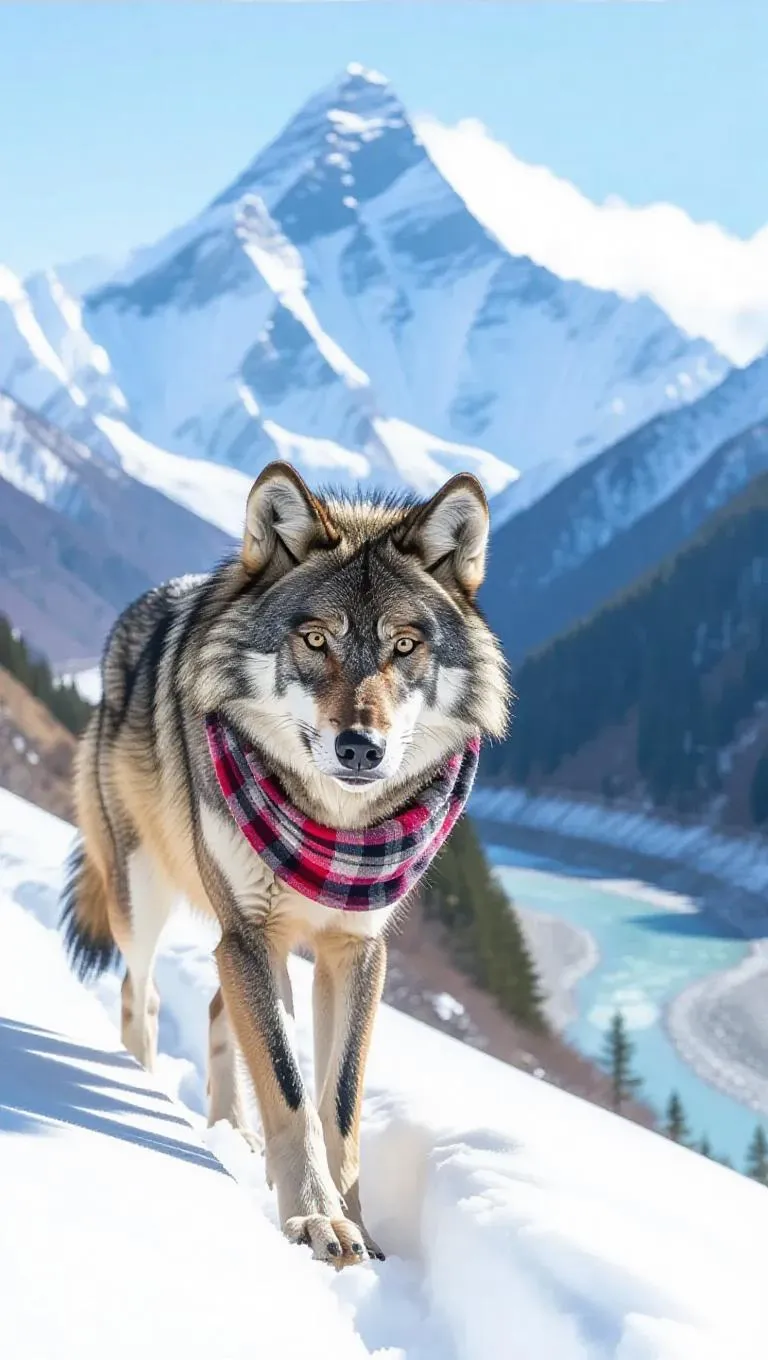 A tenacious wolf journeys across the elevated terrain of the Himalayas, its paws making subtle impressions in the untouched snow. The wolf is bundled in a substantial fur coat and a warm scarf tied snugly, its breath visible in the cold surroundings. Towering behind are impressive peaks and icy vistas, their surfaces glimmering in the sunlight. In the background, a serene river mirrors the clear blue sky, its current gentle and calming. The air is crisp and carries a hint of pine.