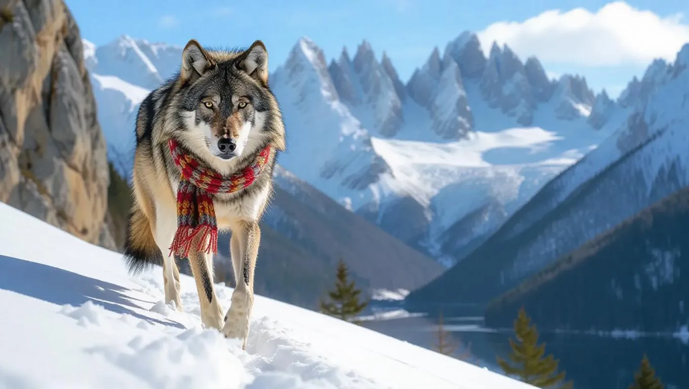 A valiant wolf traverses the craggy cliffs of the Pyrenees, its paws crunching in the frosty snow. The wolf wears a plush fur coat and a knitted scarf swaying in the breeze, its breath making clouds in the cold air. Behind it, tall peaks and snowy landscapes loom, their textures shining in the sunlight. In the distance, a calm lake reflects the bright blue sky, its waters peaceful and smooth. The setting is fresh and infused with pine's refreshing scent.