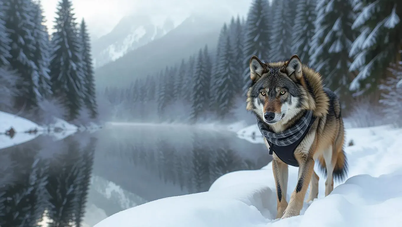 A persistent wolf treks through the wild terrains of the Black Forest, its paws cracking through the light dusting of snow. The wolf wears a warm fur jacket with a hood and a scarf wrapped tightly around its neck, its breath visible in the cool mist. Towering trees and snow-covered hills dominate the backdrop, their surfaces glimmering under the pale sun. In the distance, a quiet pond mirrors the soft gray clouds, its waters tranquil. The air is crisp with the scent of fresh pine.