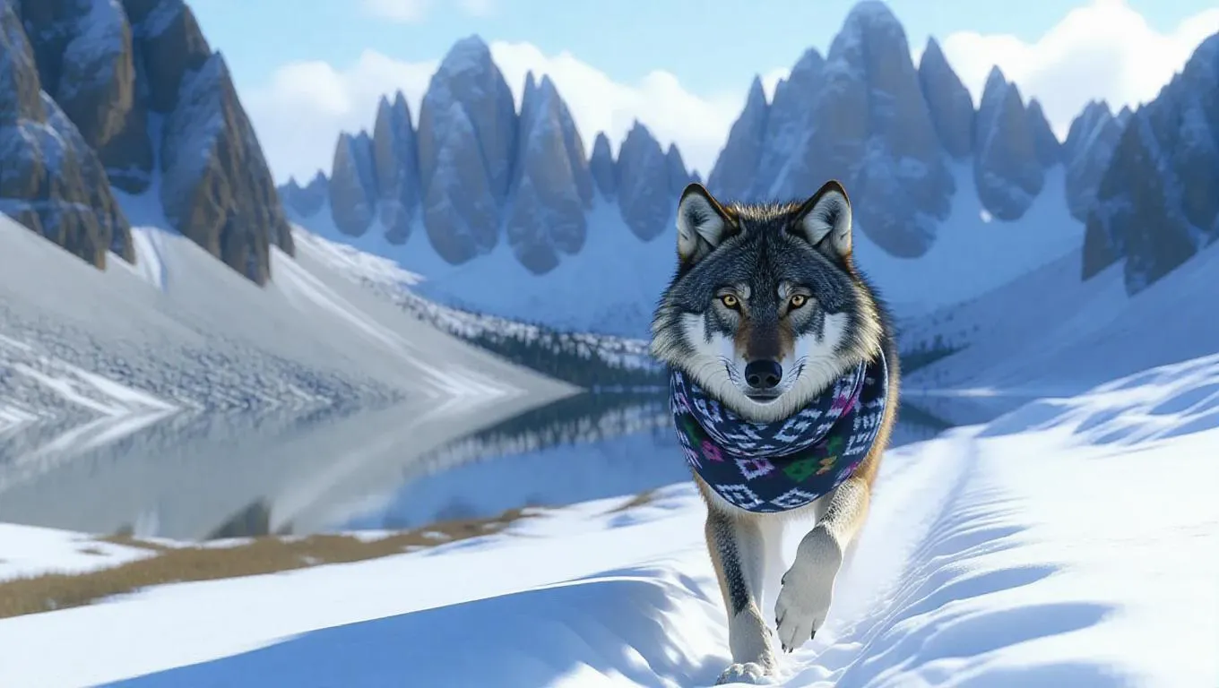 A bold wolf moves through the challenging ridges of the Dolomites, its paws crunching through the fresh snow. The wolf is wrapped in a thick fur coat and a beautifully patterned scarf, its breath visible against the frosty air. Towering behind it are sharp peaks and icy patches, their surfaces sparkling brilliantly in the sun. In the distance, a small lake reflects the majestic mountains, its waters calm and serene. The atmosphere is refreshing and carries the scent of wildflowers hidden beneath the snow.