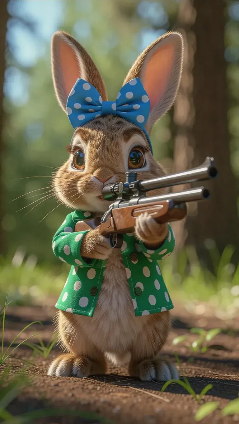 A playful little rabbit takes a shooting stance, its blue bow sitting atop its head. The rabbit wears a green and white polka dot shooting jacket, with floppy ears and small paws. It holds a professional air rifle, its eyes wide open in perfect concentration as it prepares to shoot. The background is a scenic forest shooting range, ensuring the focus remains entirely on the rabbit. The lighting is bright and cheerful, casting soft shadows, enhancing the hyperrealistic, animated-style rendering.