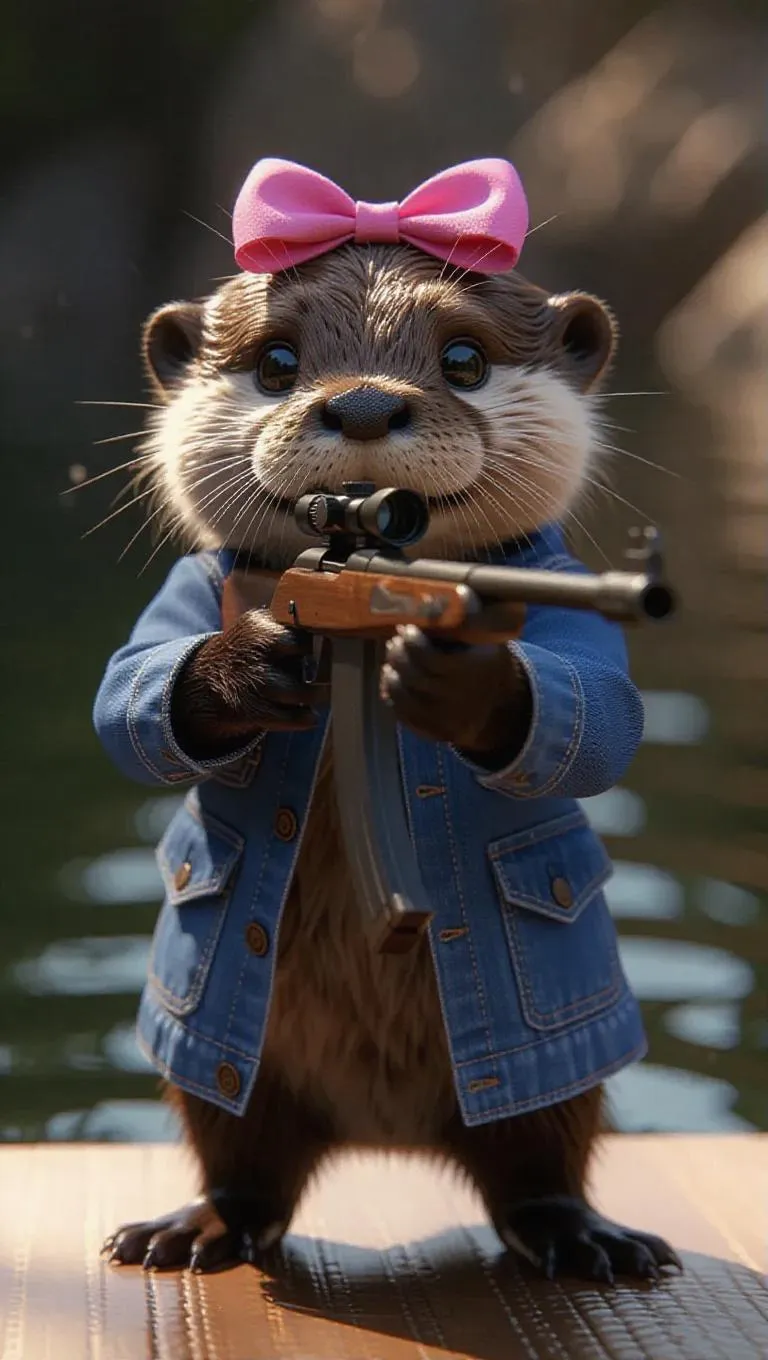 A curious little otter takes a shooting stance, its pink bow adorably positioned on its head. The otter wears a light blue denim shooting jacket, with sleek ears and webbed paws. It holds a professional air rifle, its eyes wide open in eager anticipation as it prepares to shoot. The background is a tranquil lake shooting range, ensuring the focus remains entirely on the otter. The lighting is gentle and diffused, enhancing the dreamy atmosphere, enhancing the hyperrealistic, animated-style rendering.