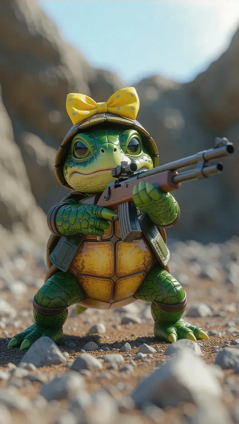 An energetic little turtle strikes a shooting stance, its yellow bow brightly displayed atop its head. The turtle wears a green camo shooting jacket, with tiny ears and sturdy flippers. It holds a professional air rifle, its eyes focused and serious as it prepares to shoot. The background is a rugged rocky shooting range, ensuring the focus remains entirely on the turtle. The lighting is crisp and clear, highlighting details, enhancing the hyperrealistic, vibrant-style rendering.