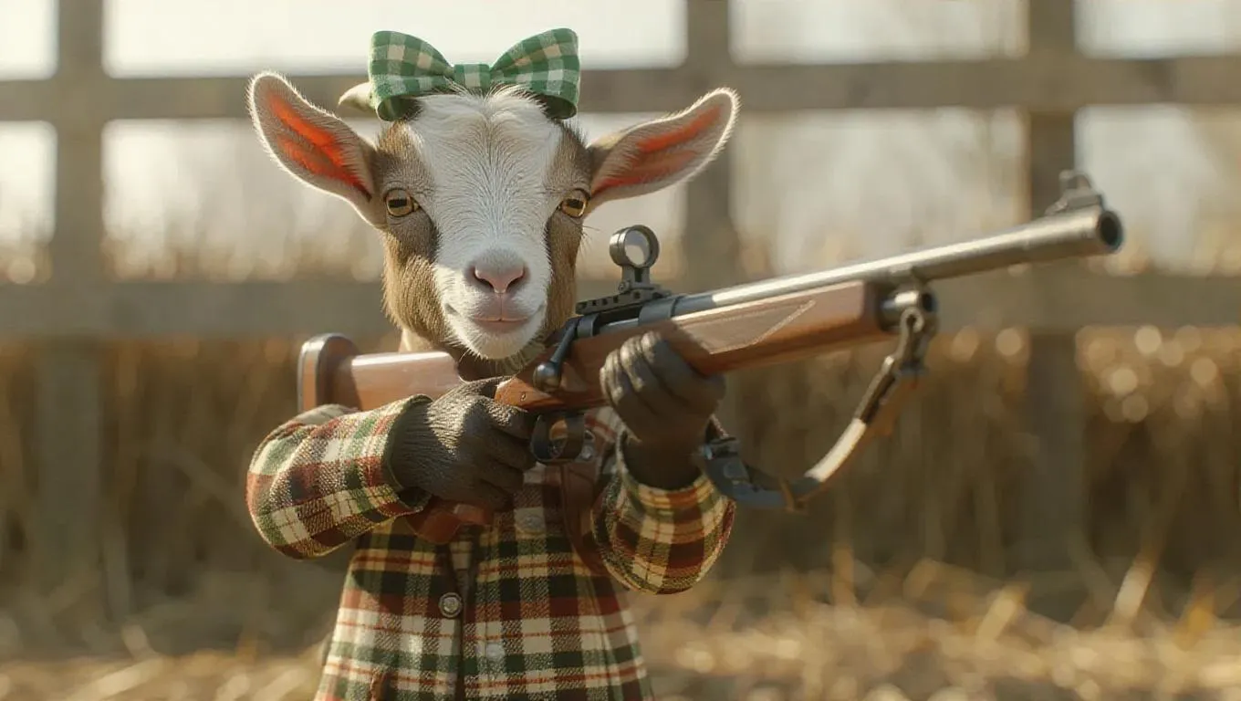 A curious little goat poses in a shooting stance, its green bow whimsically perched atop its head. The goat wears a checked shooting jacket in brown and beige, with perky ears and sturdy legs. It holds a quirky air rifle, its eyes glinting with mischief as it prepares to shoot. The background is a rustic farm shooting range, ensuring the focus remains entirely on the goat. The lighting is soft and inviting, creating a warm atmosphere, enhancing the hyperrealistic, countryside-style rendering.