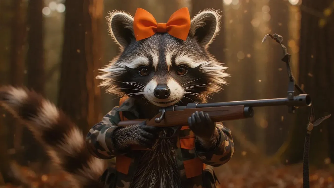 An imaginative little raccoon assumes a shooting stance, its orange bow adorably lopsided on its head. The raccoon sports a black and gray camo shooting jacket, with curious eyes and agile paws. It holds a cartoonish air rifle, its eyes flaring with enthusiasm as it prepares to shoot. The background is a mystical woodland shooting range, ensuring the focus remains entirely on the raccoon. The lighting is twinkling and magical, giving an enchanted effect, enhancing the hyperrealistic, fantasy-style rendering.
