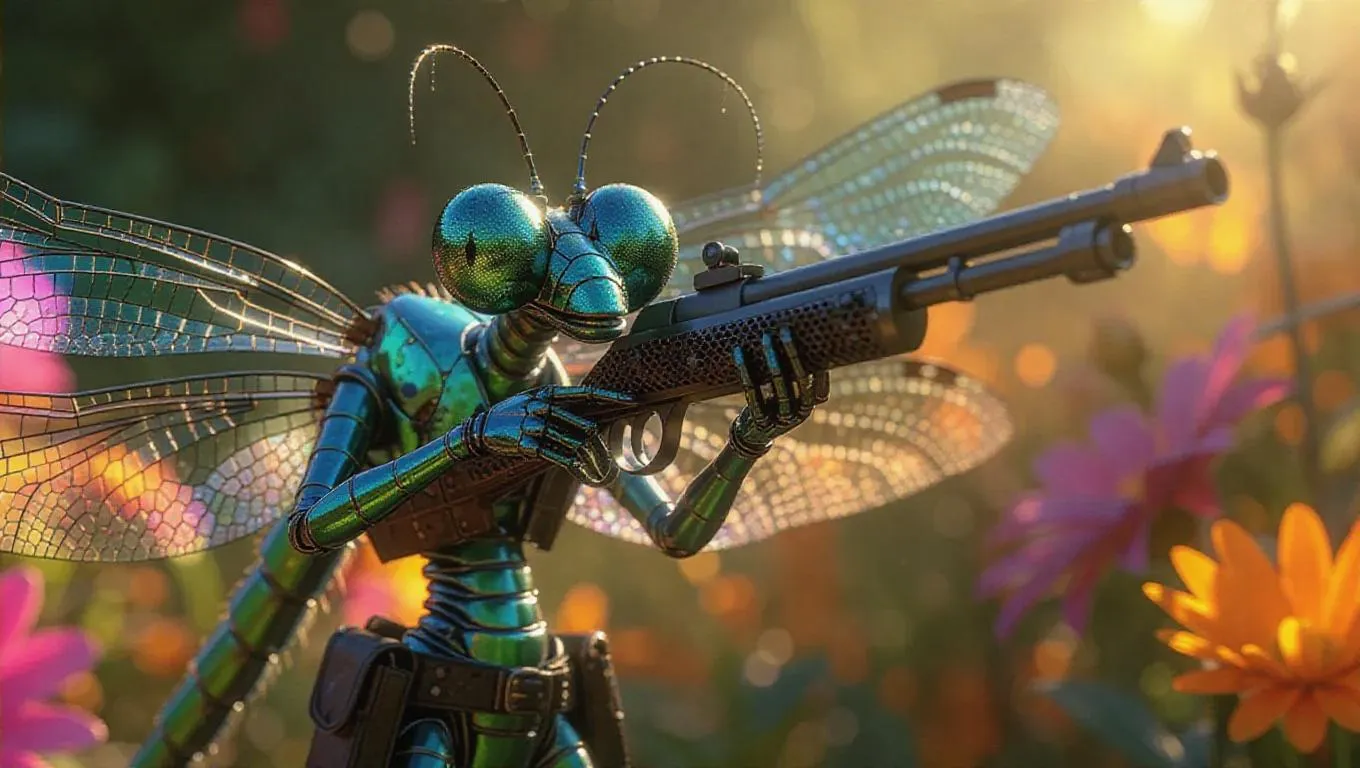 A dazzling little dragonfly takes a shooting stance, its glittering aqua bow adorning its head. The dragonfly wears a mesh shooting jacket with iridescent colors, with slender wings and delicate features. It holds a tiny air rifle, its eyes sparkling mischievously as it prepares to shoot. The background is a vibrant flower garden shooting range, ensuring the focus remains entirely on the dragonfly. The lighting is bright and cheerful, highlighting its sheen, enhancing the hyperrealistic, magical realism rendering.