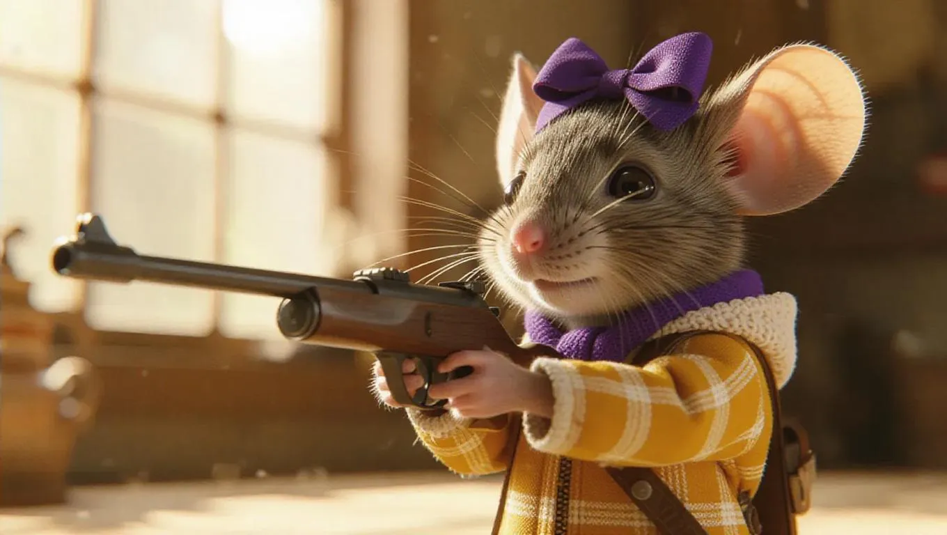 A determined little mouse takes a shooting stance, its purple bow adorably perched atop its head. The mouse wears a tiny shooting jacket in mustard and white, with twitching nose and bright eyes. It holds a mini air rifle, its eyes focused intently as it prepares to shoot. The background is a cozy cottage shooting range, ensuring the focus remains entirely on the mouse. The lighting is soft and warm, creating an inviting feel, enhancing the hyperrealistic, storybook-style rendering.