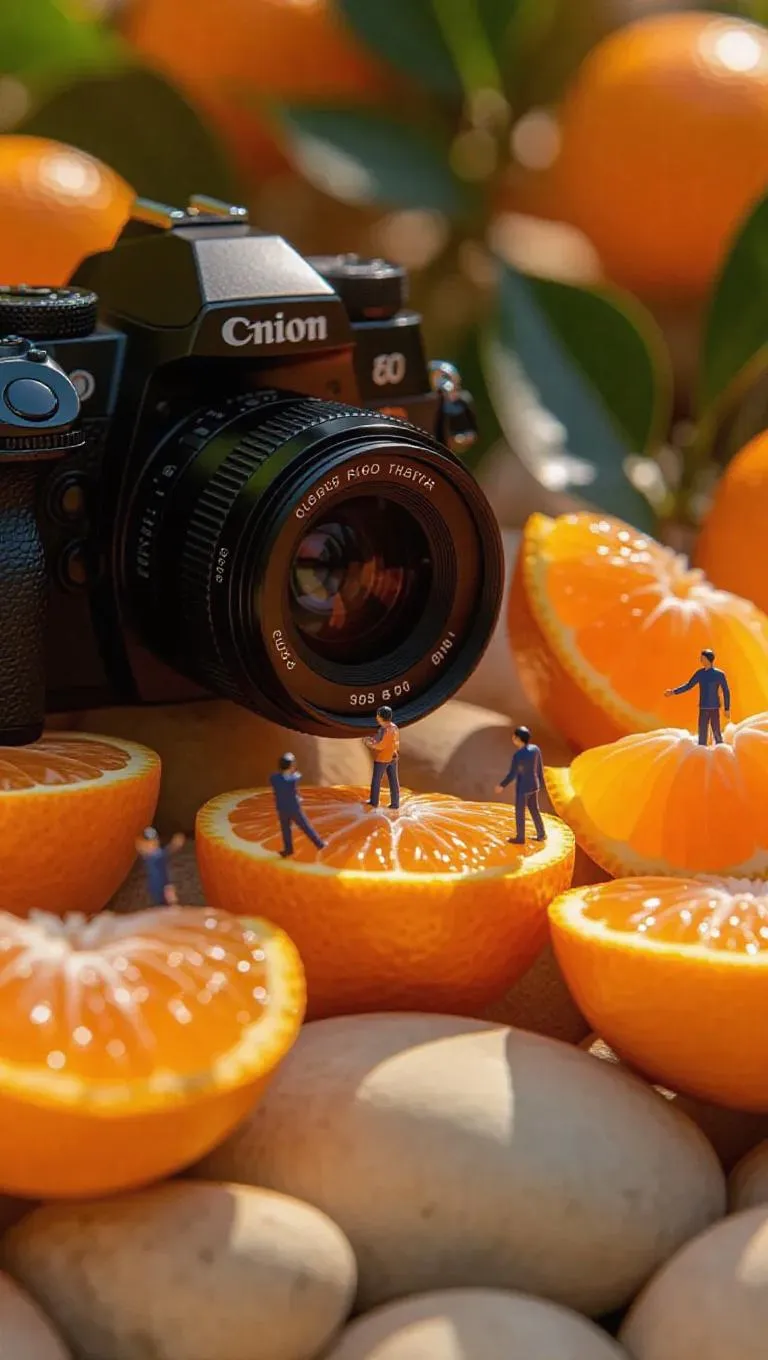 The camera begins with a close-up of the intricate details of the orange segments, showcasing the vibrant orange flesh. It then performs a slow push-in, gradually revealing miniature thumb-sized people engaged in various activities around the tangerine. The figures move subtly, enhancing the sense of depth and playfulness. The natural textures of the surrounding stones and plants remain in focus, adding to the scene's charm. The setting is a sunlit orchard with soft breezes and the distant sound of playful laughter.