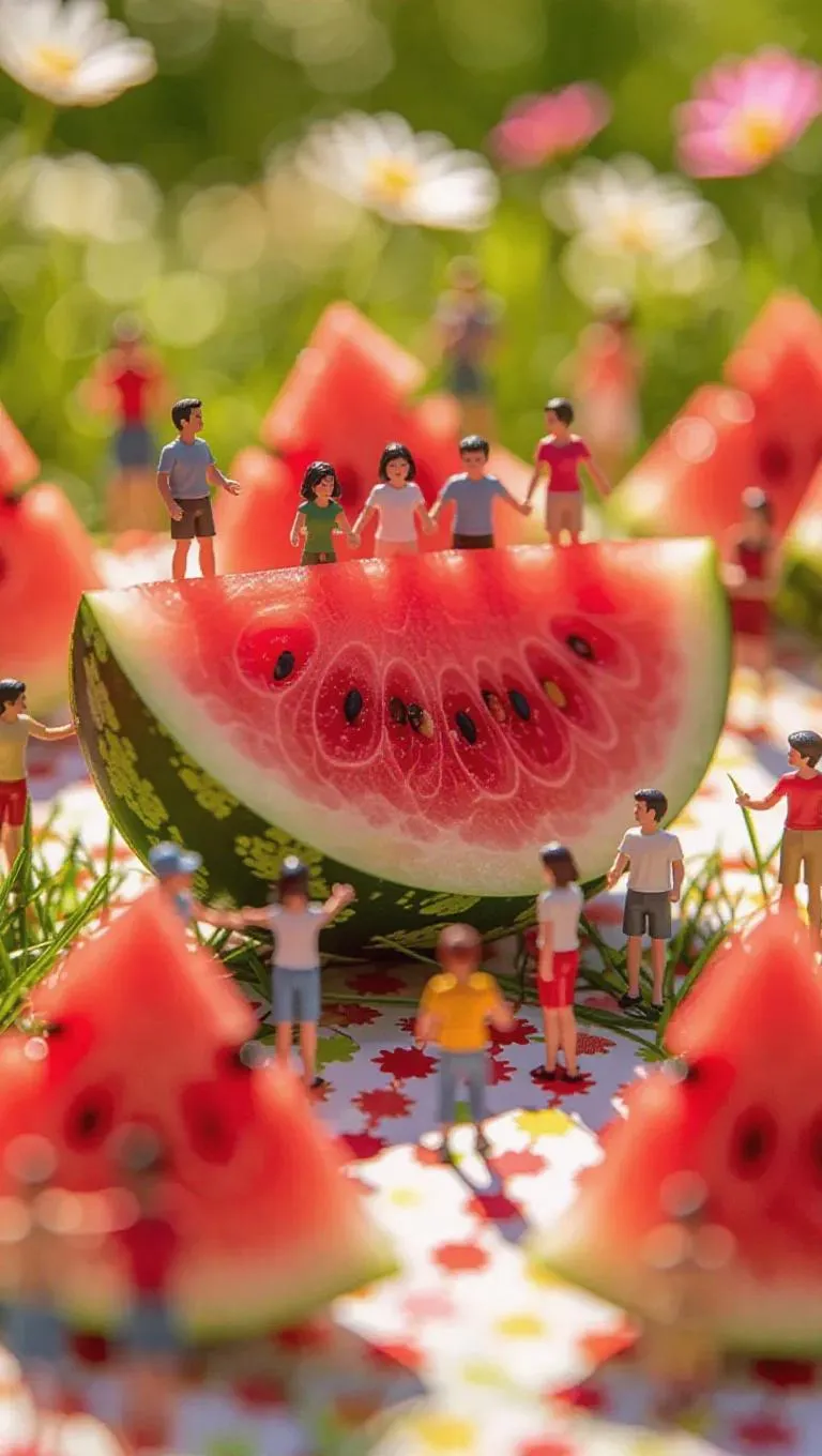 The camera begins with a close-up of the intricate details of the watermelon segments, showcasing the vibrant pink flesh. It then performs a slow push-in, gradually revealing miniature thumb-sized people engaged in various activities around the watermelon. The figures move subtly, enhancing the sense of depth and playfulness. The natural textures of the surrounding grass and flowers remain in focus, adding to the scene's charm. The setting is a sunny picnic area with bright tablecloths and the distant sound of kids playing.