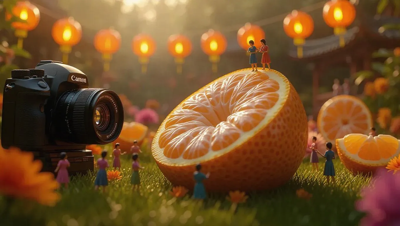The camera begins with a close-up of the intricate details of the mandarin segments, showcasing the vibrant orange flesh. It then performs a slow push-in, gradually revealing miniature thumb-sized people engaged in various activities around the mandarin. The figures move subtly, enhancing the sense of depth and playfulness. The natural textures of the surrounding grass and flowers remain in focus, adding to the scene's charm. The setting is a festive gathering with lanterns hanging and the distant sound of live music.