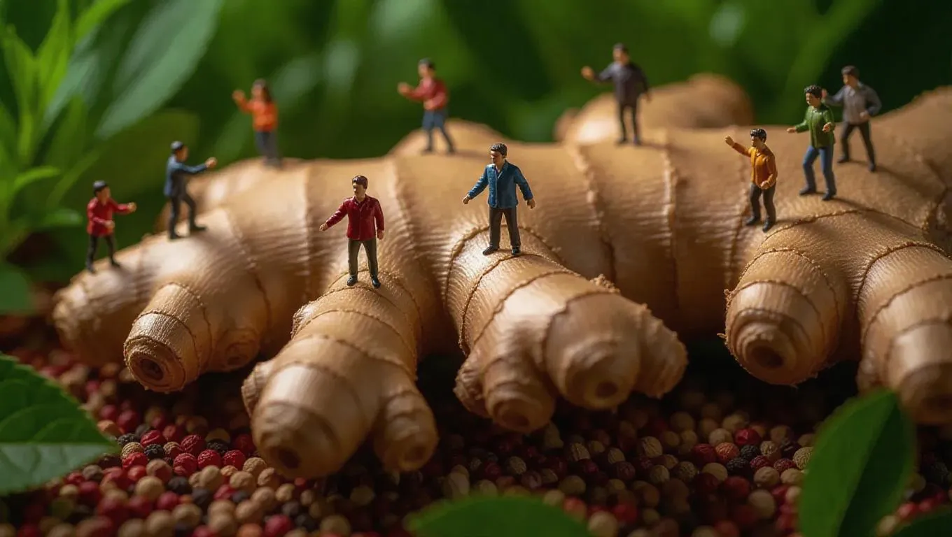 The camera begins with a close-up of the intricate details of the ginger segments, showcasing the vibrant brown flesh. It then performs a slow push-in, gradually revealing miniature thumb-sized people engaged in various activities around the ginger. The figures move subtly, enhancing the sense of depth and playfulness. The natural textures of the surrounding herbs and spices remain in focus, adding to the scene's charm. The setting is a cozy herb garden with fragrant aromas and the distant sound of wind through the leaves.