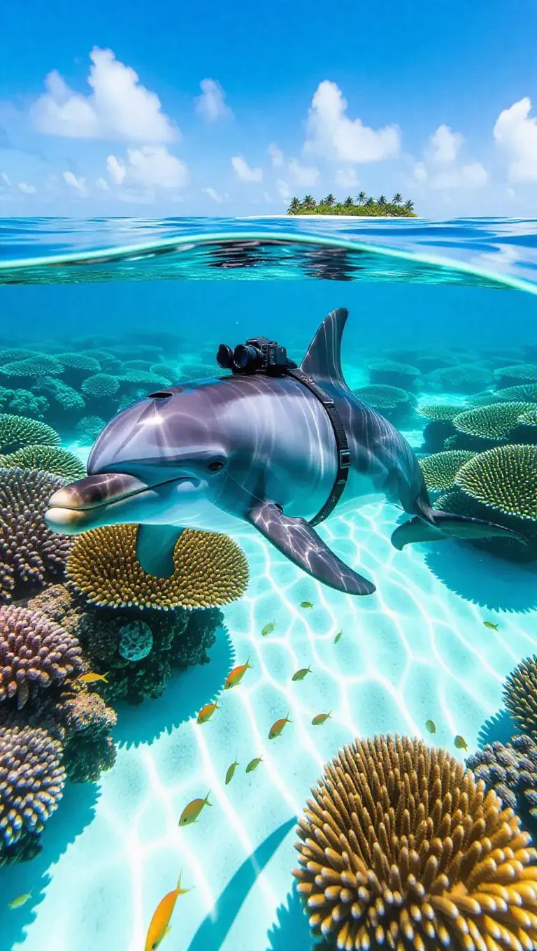 A playful dolphin swims through the crystal-clear waters of the Maldives, its sleek body glistening in the sunlight. The dolphin wears a small harness with a camera attached, capturing the vibrant underwater world. Around it, colorful coral reefs and tropical fish create a kaleidoscope of colors. In the distance, a small island sits on the horizon, its sandy