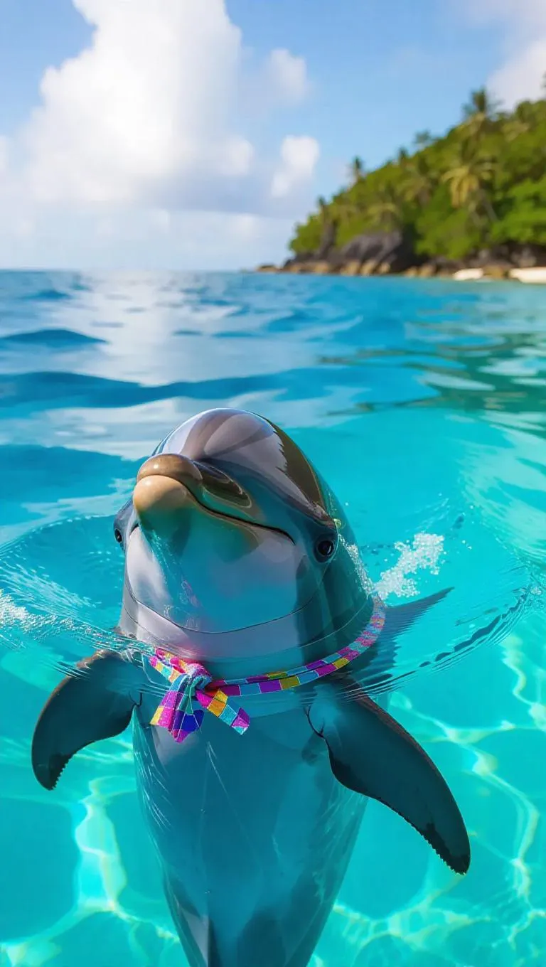 A lively dolphin frolics in the azure waters of the Seychelles, its sleek body glowing in the afternoon light. The dolphin has a playful scarf tied around its fin, flapping joyfully. Nearby, schools of tiny neon fish and intricate coral sculptures offer a vivid display. In the distance, a lush island peeks through the clear sky, inviting exploration.