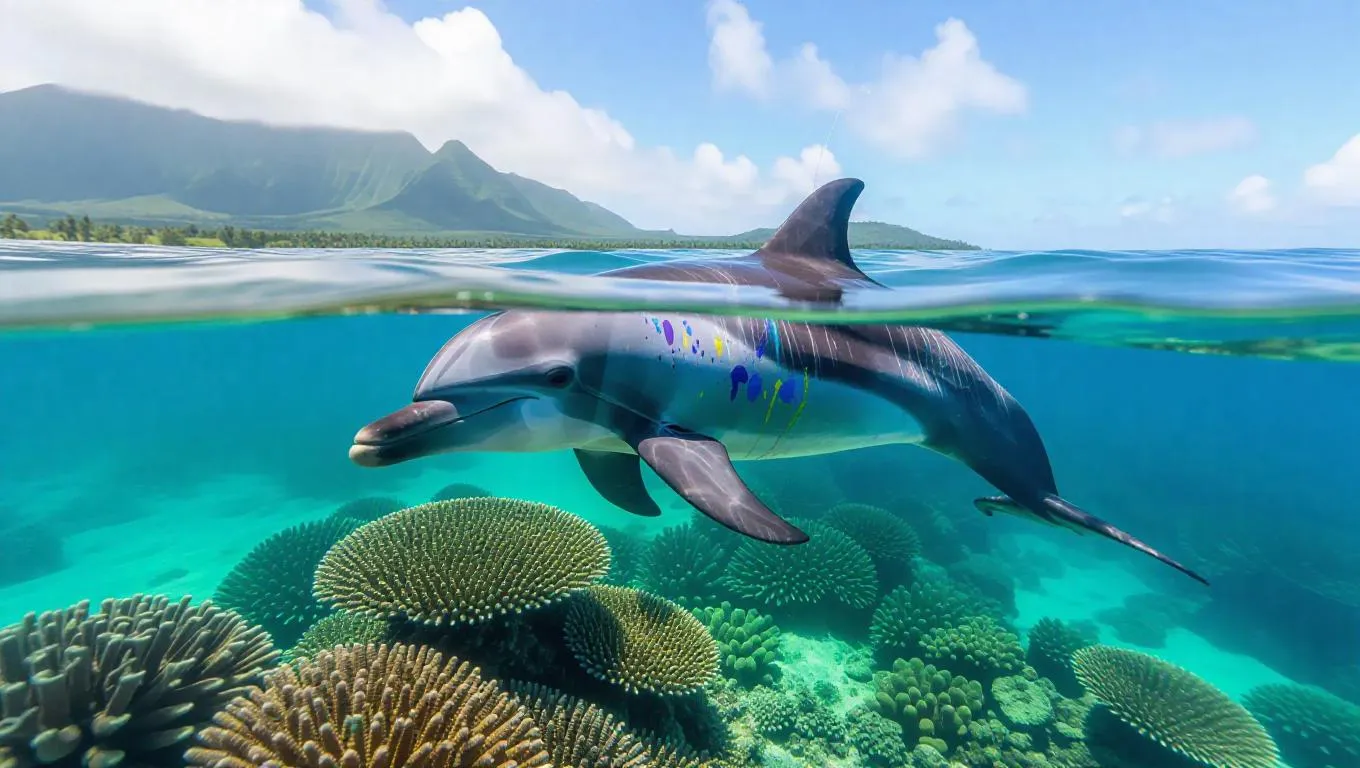 A creative dolphin swims through the vibrant turquoise waters of Mauritius, its sleek body sparkling in the sunlight. The dolphin is adorned with paint splashes across its back, showcasing its artistic flair. Surrounding it, vast fields of coral and curious moray eels create a stunning tableau. In the distance, gentle mountains rise against the backdrop of a clear sky.