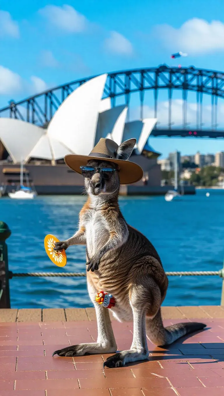 A curious kangaroo hops through the vibrant streets of Sydney, Australia, holding a small boomerang in one paw. The kangaroo wears a wide-brimmed hat and a pair of sunglasses, its pouch filled with snacks. Around it, the iconic Sydney Opera House and Harbour Bridge rise up, their surfaces reflecting the sunlight. In the distance, the blue waters of the harbor stretch out, dotted with sailboats. The air is filled with the scent of eucalyptus and the sounds of distant music.