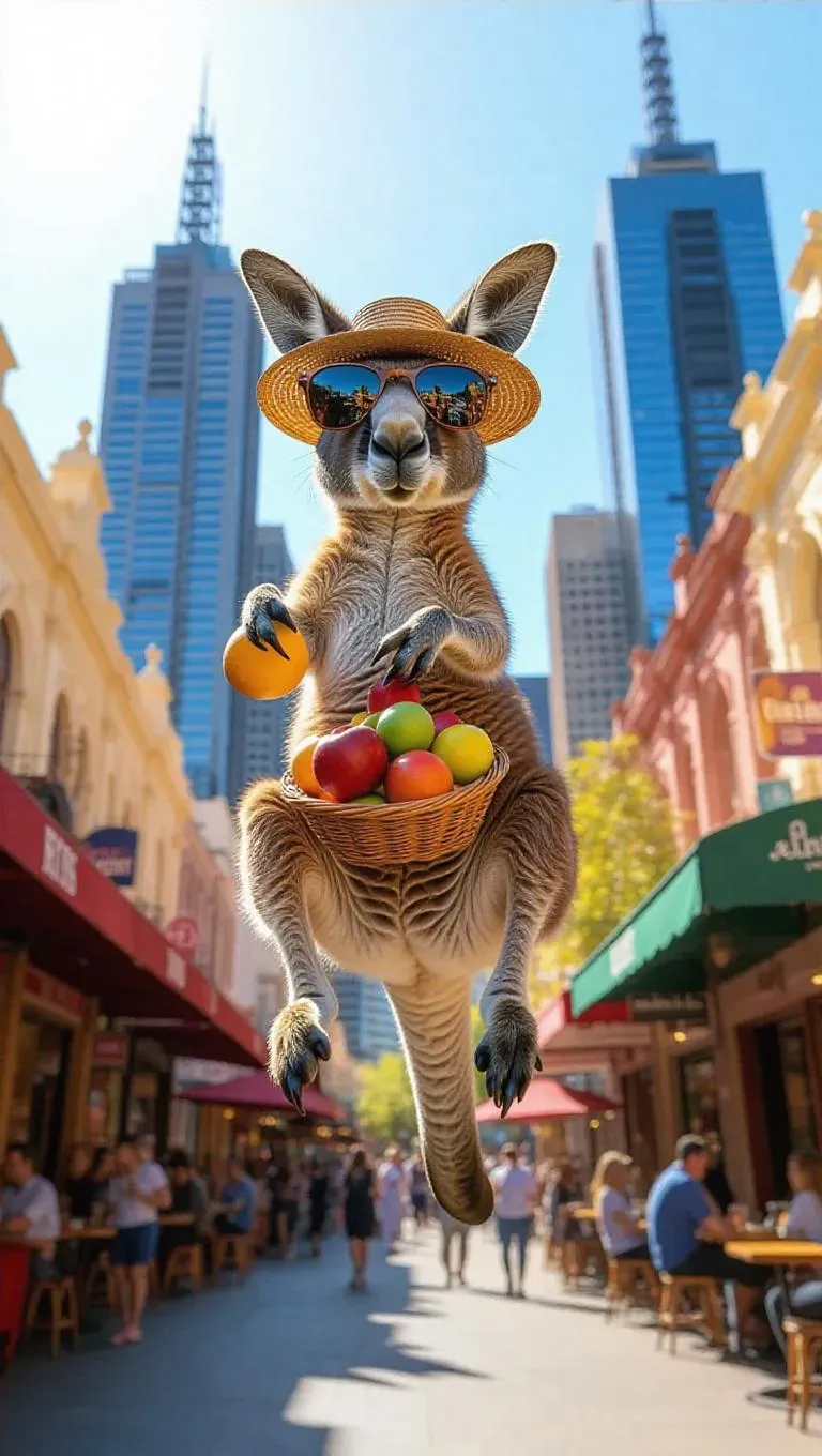 A playful kangaroo leaps across the colorful markets of Melbourne, Australia, clutching a shiny boomerang in its paw. The kangaroo dons a straw hat and trendy sunglasses, its pouch overflowing with fresh fruits. Surrounding it, the vibrant street art and café terraces create a lively atmosphere. In the background, tall skyscrapers reach for the sky, glimmering in the afternoon sun. The breeze carries the aroma of coffee and the chatter of friendly conversations.