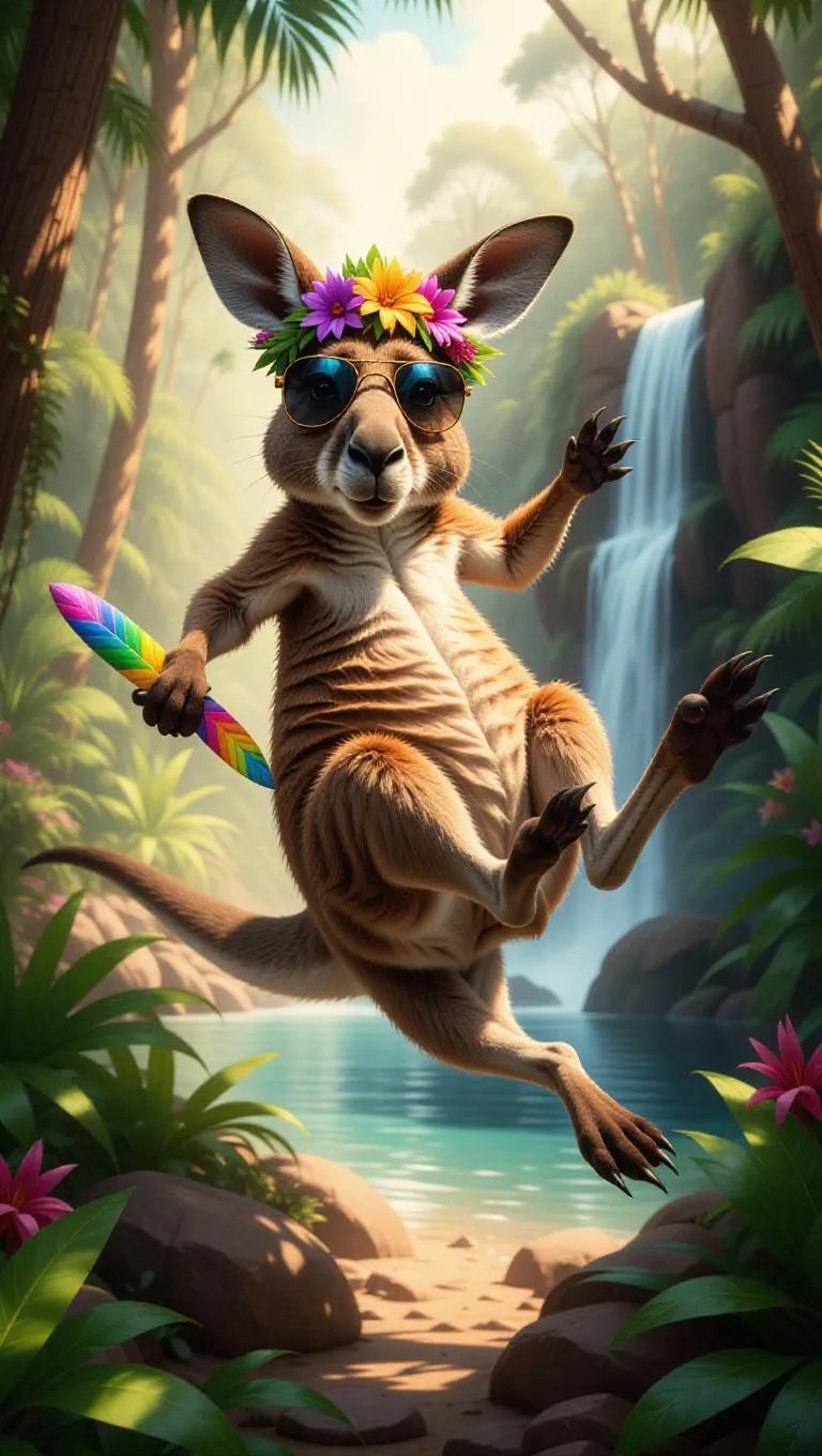An adventurous kangaroo hops through the lush rainforests of Queensland, Australia, gripping a colorful boomerang in its paw. The kangaroo wears a tropical flower crown and aviator sunglasses, its pouch filled with local fruits. Towering trees and vibrant flora create a rich tapestry around it. In the background, a waterfall cascades into a crystal-clear pool. The air is alive with the sounds of chirping birds and rustling leaves.