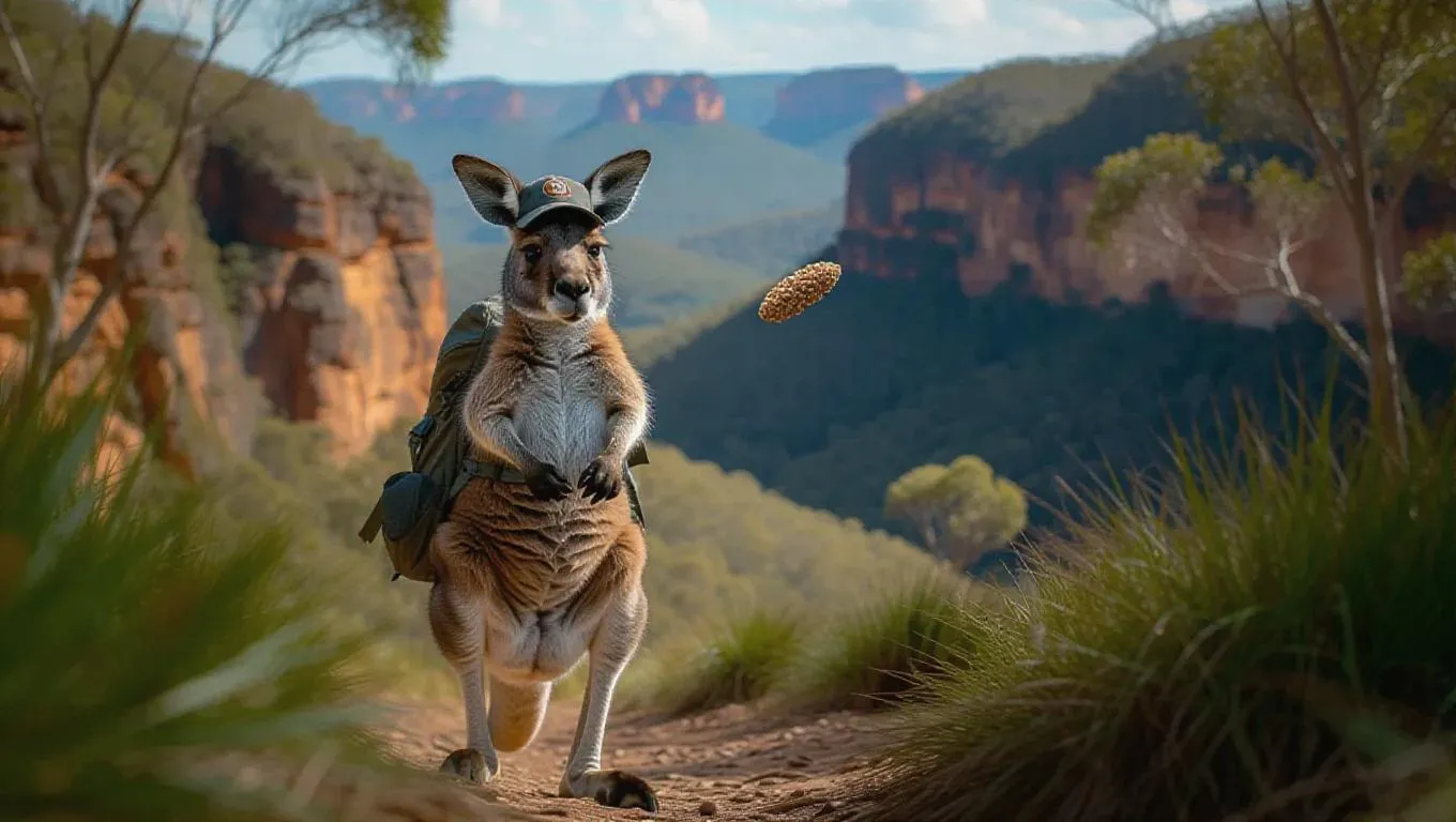 A cheerful kangaroo jogs through the scenic trails of the Blue Mountains, Australia, tossed boomerang spinning in the air. The kangaroo sports hiking gear and a baseball cap, its pouch filled with trail mix. Lush greenery and distant waterfalls provide a stunning backdrop. The air is fresh and crisp, filled with the sounds of nature and the rustle of leaves.