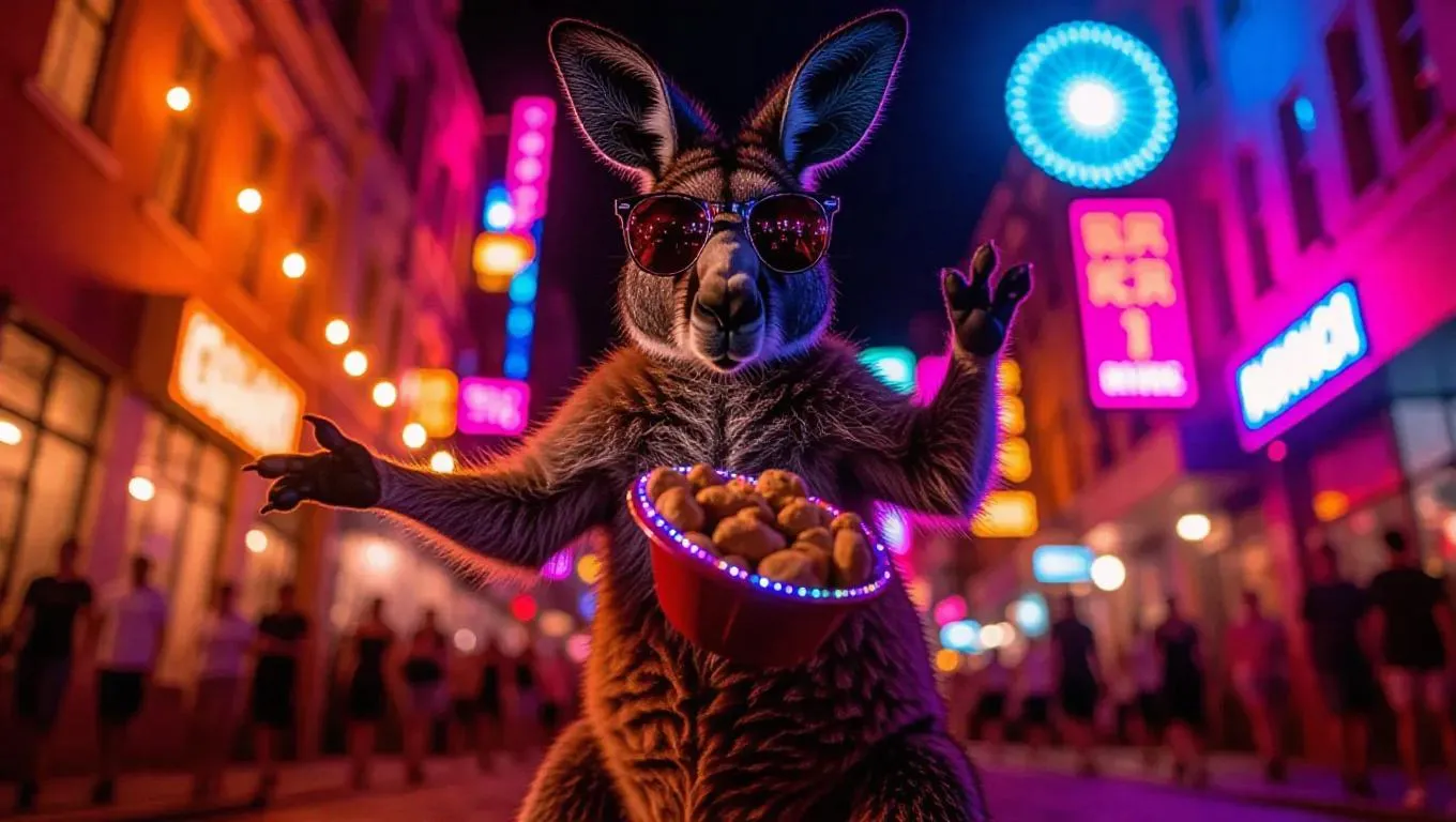 A spirited kangaroo dashes through the iconic streets of Kings Cross, Australia, playfully tossing a sparkling boomerang. The kangaroo sports funky streetwear and flashy sunglasses, its pouch filled with trendy snacks. The nightlife buzzes around it, with neon lights and music creating an energetic backdrop. The atmosphere is charged with excitement and the mingled scents of food and adventure.