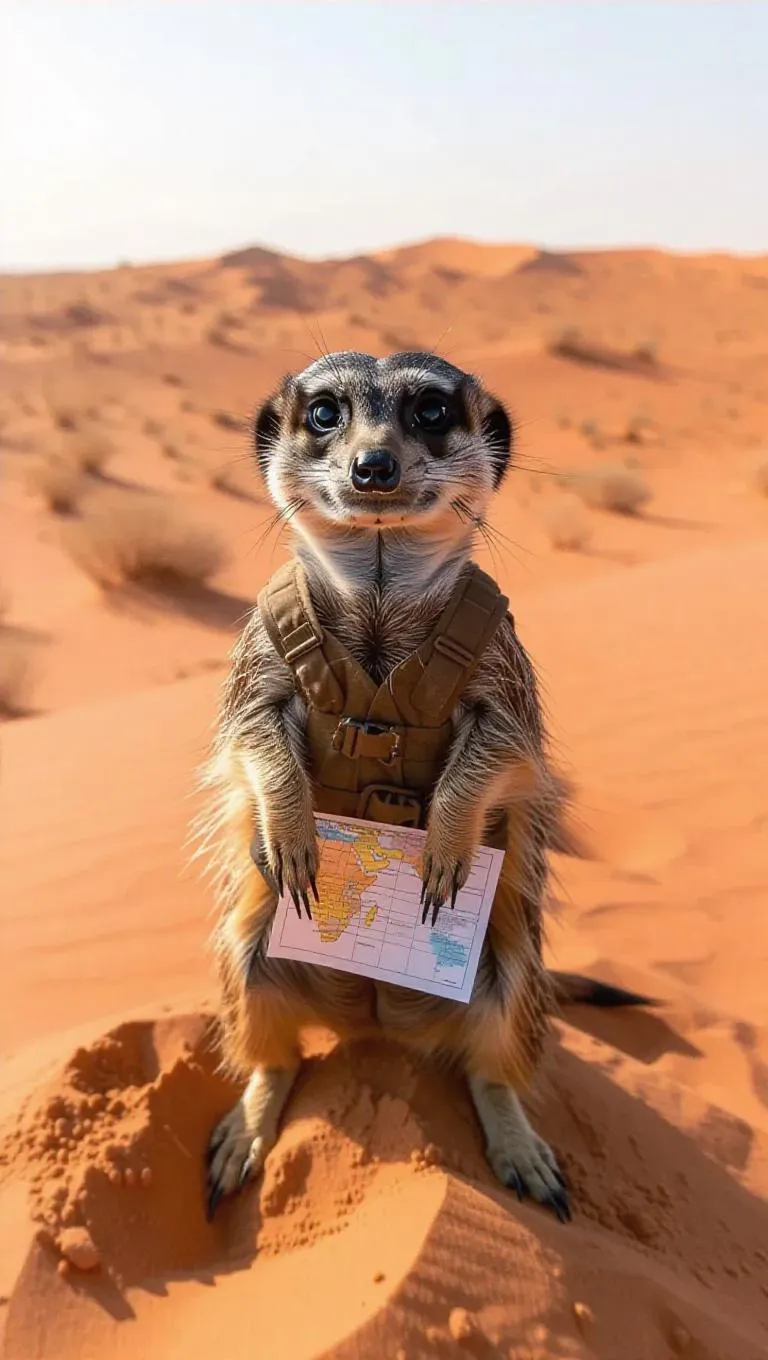 A fearless meerkat stands atop a sand dune in the Namib Desert, Namibia, its paws clutching a small map. The meerkat is dressed in a little vest and a pair of goggles, its eyes wide with determination. Stretching out before it are vast fields of orange sand and scattered shrubs, shimmering in the afternoon sun. In the vicinity, a group of meerkats is surveying their surroundings, their whispers carried on the wind. The atmosphere is bright and tinged with the scent of spices.