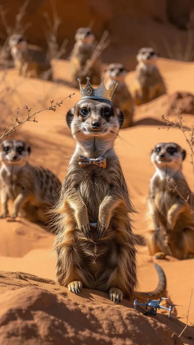 A watchful meerkat stands by a rocky ledge in the Kalahari Desert, South Africa, its paws clasping a tiny drone. The meerkat is adorned with a quirky crown and a curious bow tie, its eyes filled with intrigue. Surrounding it are sweeping views of golden sand and tufts of vegetation, illuminated by the soft glow of dusk. In the distance, several meerkats appear to be playing a game, their playful howls echoing off the rocks. The atmosphere is playful and fragrant with wild herbs.
