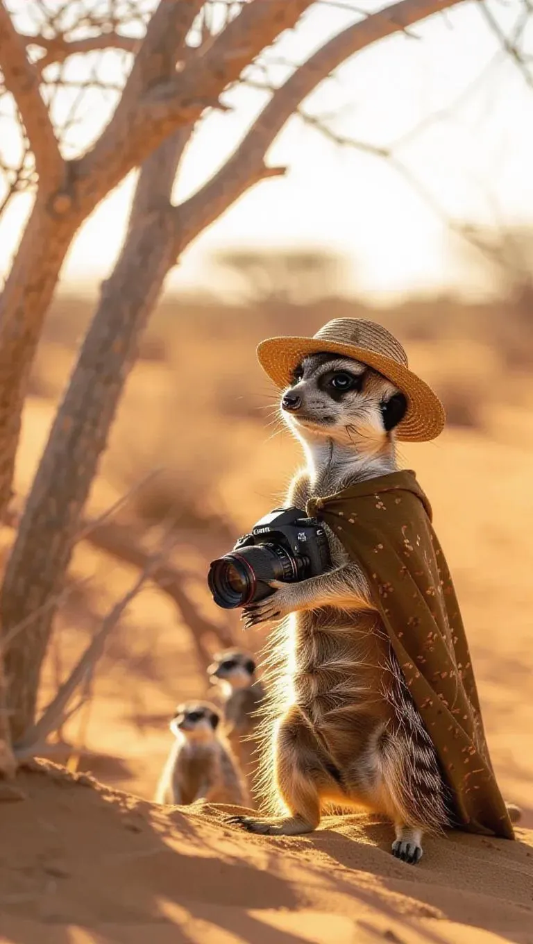 A cautious meerkat stands beside a grove of trees in the Kalahari Desert, South Africa, its paws clutching a camera. The meerkat is outfitted with a stylish sun hat and a loose cape, its gaze intent on the horizon. All around are vast stretches of sandy terrain and scattered thorny bushes, rendered dramatic by the sunlight. Nearby, a band of meerkats is huddled, their secrets shared in hushed tones. The air smells of warm clay and aged wood.