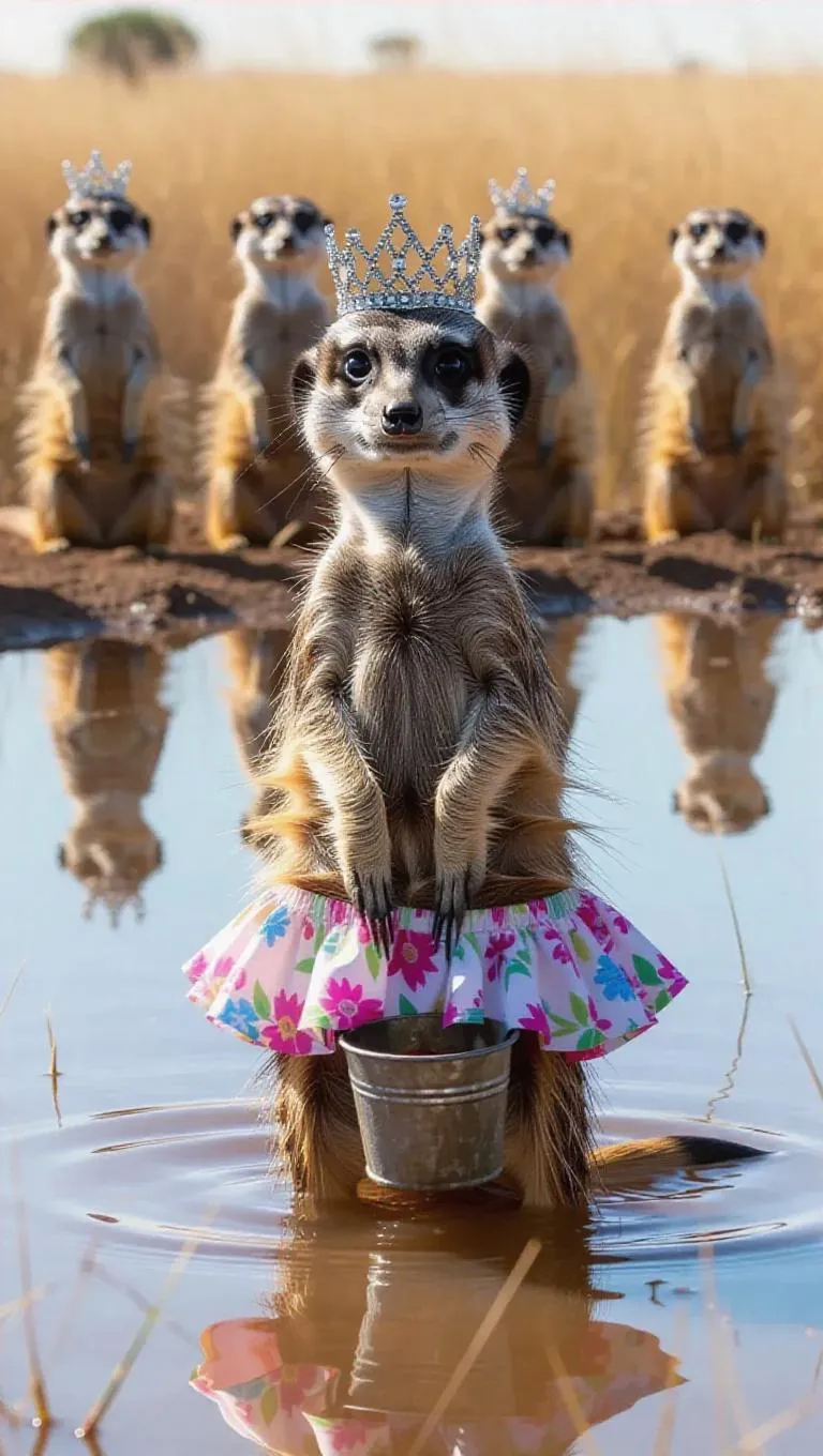 A curious meerkat stands at a waterhole in the Kalahari Desert, South Africa, its paws holding a small bucket. The meerkat sports a floral skirt and a bejeweled tiara, its gaze fixed on the shimmering surface. Around it, reflections dance on the water’s edges, with tufts of tall grass fluttering in the breeze. In the background, a cluster of meerkats is playfully splashing water, their laughter ringing out. The scent of wet earth mingles with the warm sun.