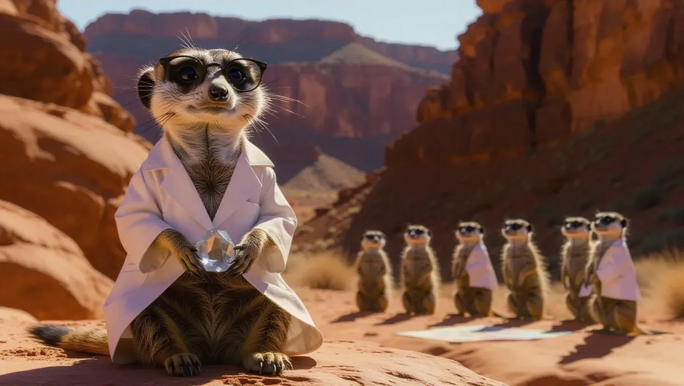 A thoughtful meerkat sits on a stone near a canyon in the Kalahari Desert, South Africa, its paws cradling a crystal. The meerkat wears a white lab coat and quirky glasses, its eyes glimmering with insight. The surroundings are a mix of expansive desert wilderness and rocky cliffs, brightened by early morning rays. Close by, a few meerkats are gathering around a map, their whispers rich with plans. The air feels electric with anticipation.