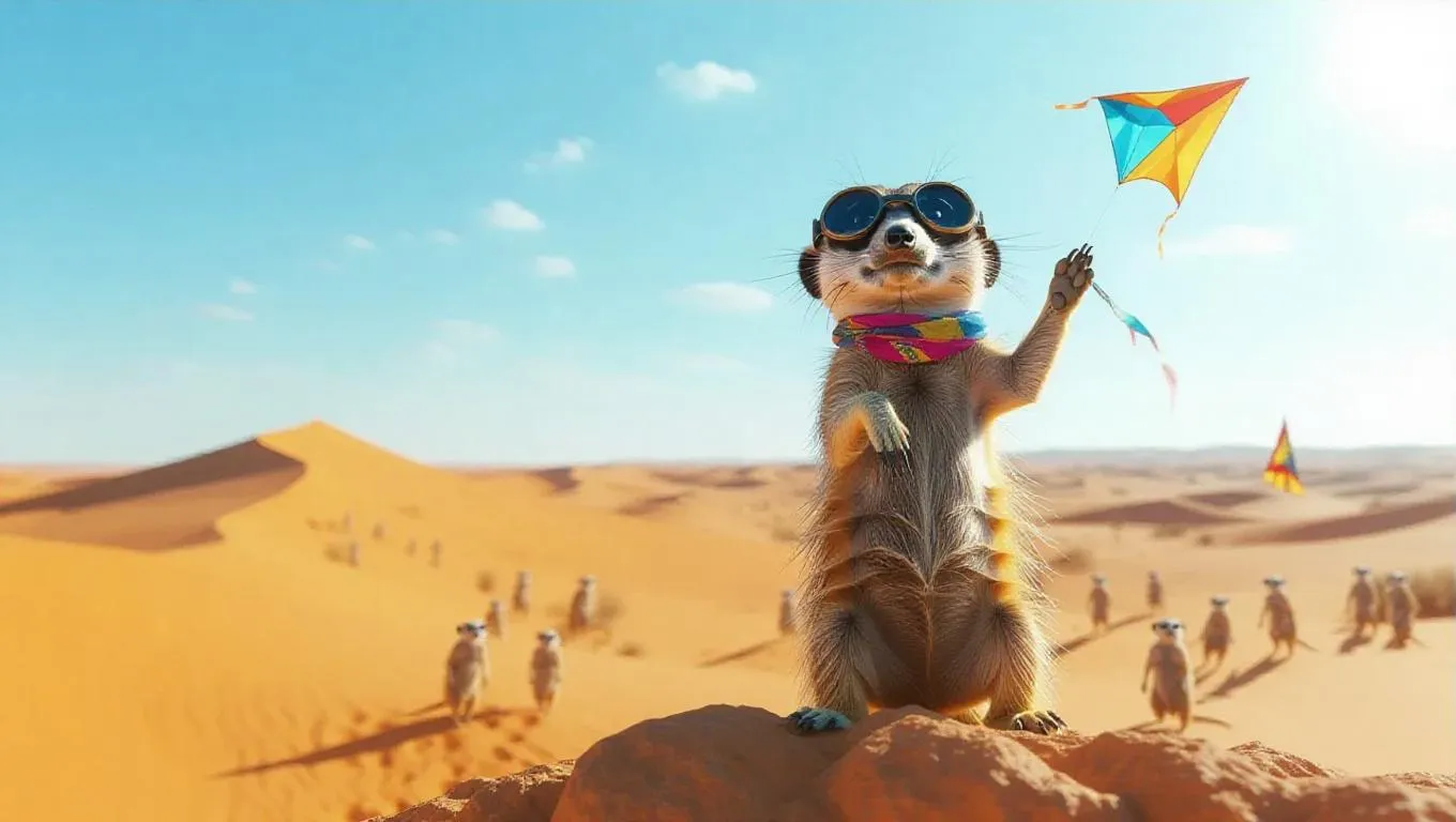 An adventurous meerkat stands at the edge of a cliff in the Kalahari Desert, South Africa, its paws gripping a small kite. The meerkat is dressed in aviator goggles and a colorful scarf, its eyes filled with exhilaration. The backdrop is an endless sea of orange and yellow dunes, shimmering under the bright sun. In the distance, a few meerkats are practicing their jumps, their playful yelps echoing around. The air is fresh, infused with hints of wild grass.