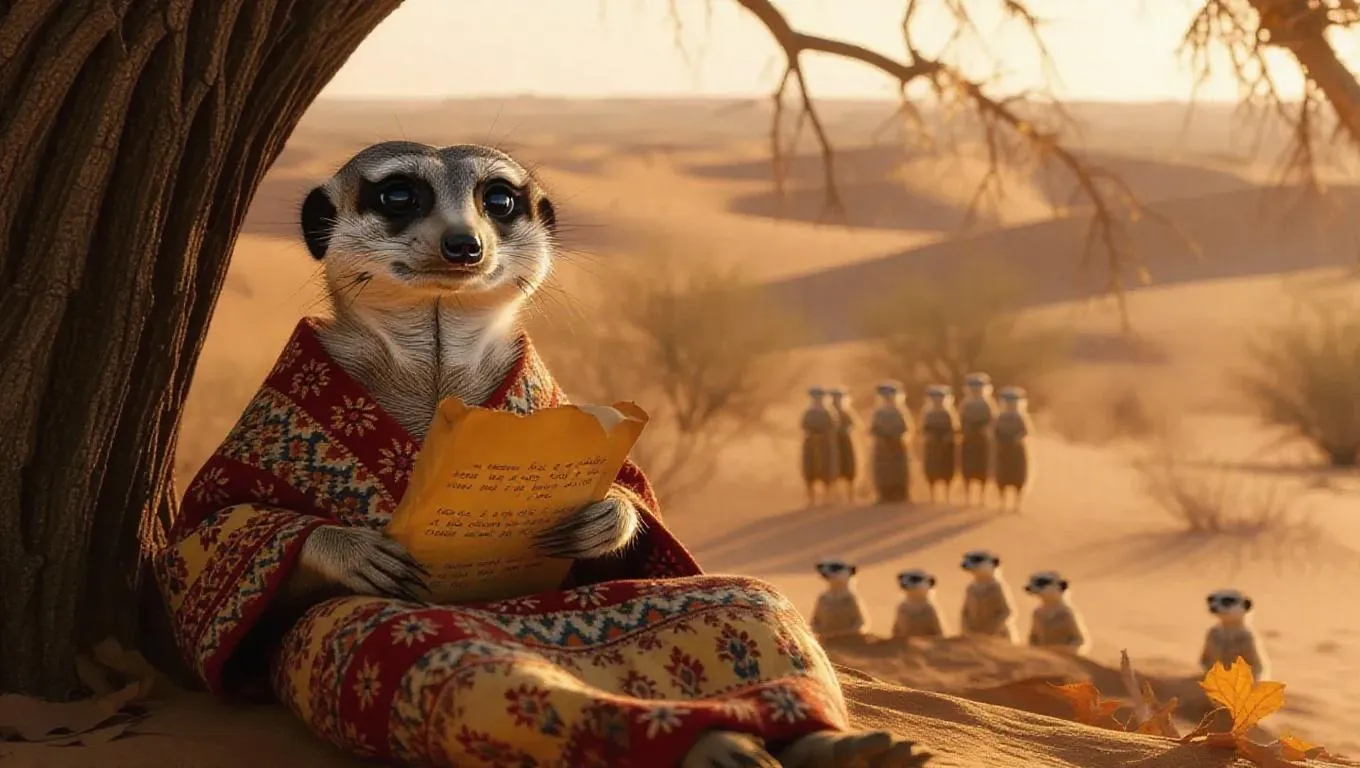 A wise meerkat sits under a tree in the Kalahari Desert, South Africa, its paws holding an old scroll. The meerkat is wrapped in a traditional robe adorned with patterns, its eyes reflective and calm. The environment features gentle rolling dunes and scattered shrubs, illuminated by the warm glow of sunset. In the distance, a small group of meerkats engages in storytelling, their voices soft and melodic. The air is imbued with the calming scent of falling leaves.