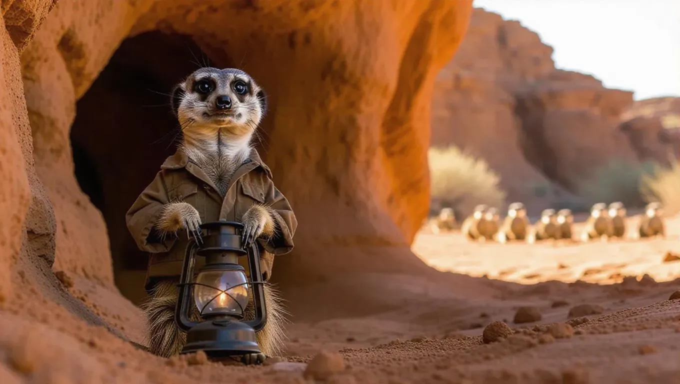 A brave meerkat stands at the entrance of a cave in the Kalahari Desert, South Africa, its paws grasping a lantern. The meerkat is outfitted in a sturdy jacket and heavy boots, its eyes sparkling with adventure. Surrounding it are rugged rock formations and pathways of sand, creating a contrast of textures. Nearby, a band of meerkats appears ready to explore, their murmurs infusing courage into the air. The scent of damp earth is blended with anticipation.