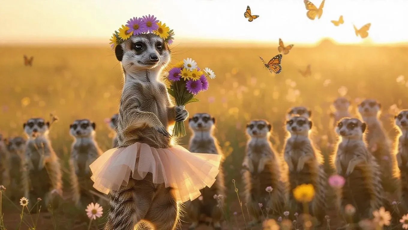 A whimsical meerkat prances in the meadows of the Kalahari Desert, South Africa, its paws holding a bouquet of flowers. The meerkat wears a flowing dress and a flower crown, its eyes shining brightly. The backdrop is a brilliant blend of greens and yellows, dancing under the golden sun. Nearby, a cheerful group of meerkats plays with butterflies, their joy lighting up the scene. The air is sweet with floral fragrances.