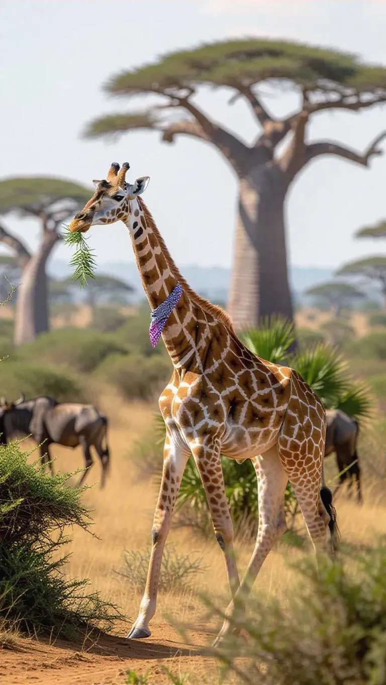 A playful giraffe strolls across the plains of the Serengeti, Tanzania, its neck elegantly bending to nibble on the green shoots of a baobab tree. The giraffe sports a bright bandana and a stylish hat, its gaze exploring the surroundings. Surrounding it, lush bushes and scattered palm trees spread out, their leaves shimmering in the sun. In the distance, a small group of wildebeests grazes silently, their sounds blending into the atmosphere. The air is cool and rich with the aroma of soil and foliage.
