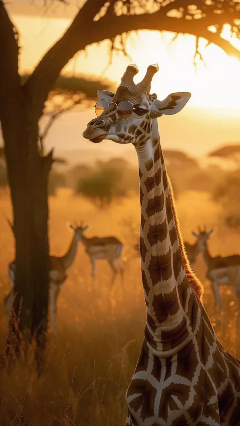 A young giraffe explores the landscapes of the Serengeti, Tanzania, its long neck curving gracefully to reach the flowers atop a tall tree. This giraffe is accessorized with a little vest and round sunglasses, its eyes searching for any movement. Tall grasses and sparse trees scatter across the scene, their surfaces illuminated by bright sunlight. In the background, a small gathering of gazelles grazes with elegance, their sounds mingling in the backdrop. The air is sunny, infused with the fragrance of grass and warm earth.