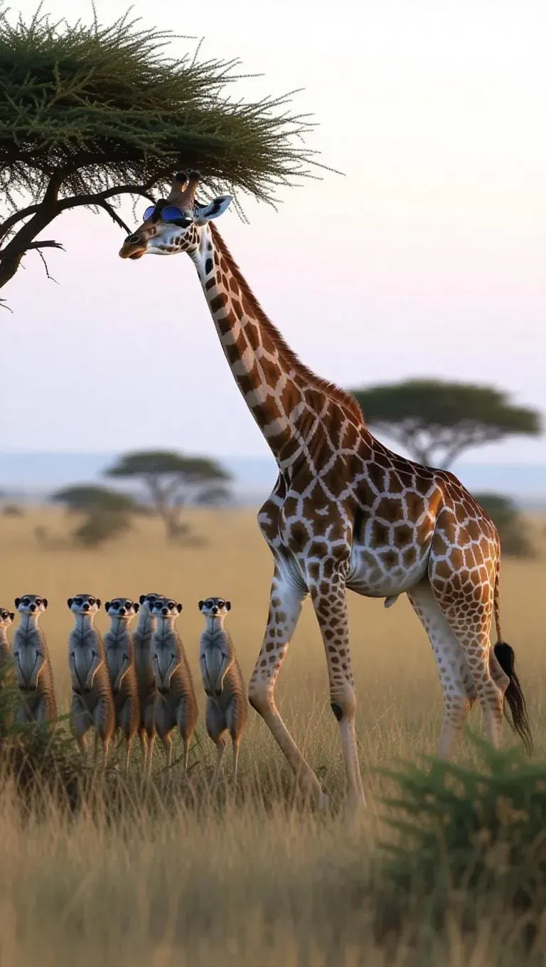 A graceful giraffe roams through the wild landscapes of the Serengeti, Tanzania, its lengthening neck reaching high for the delicious fruits of a marula tree. The giraffe is dressed in a patterned poncho and sleek goggles, its bright eyes scanning for predators. Lush grasslands and sporadic trees create a beautiful setting, their forms highlighted by the evening glow. In the distance, a small clan of meerkats stands guard, their alert calls filling the air. The atmosphere is tranquil, heavy with the scent of earth and foliage.