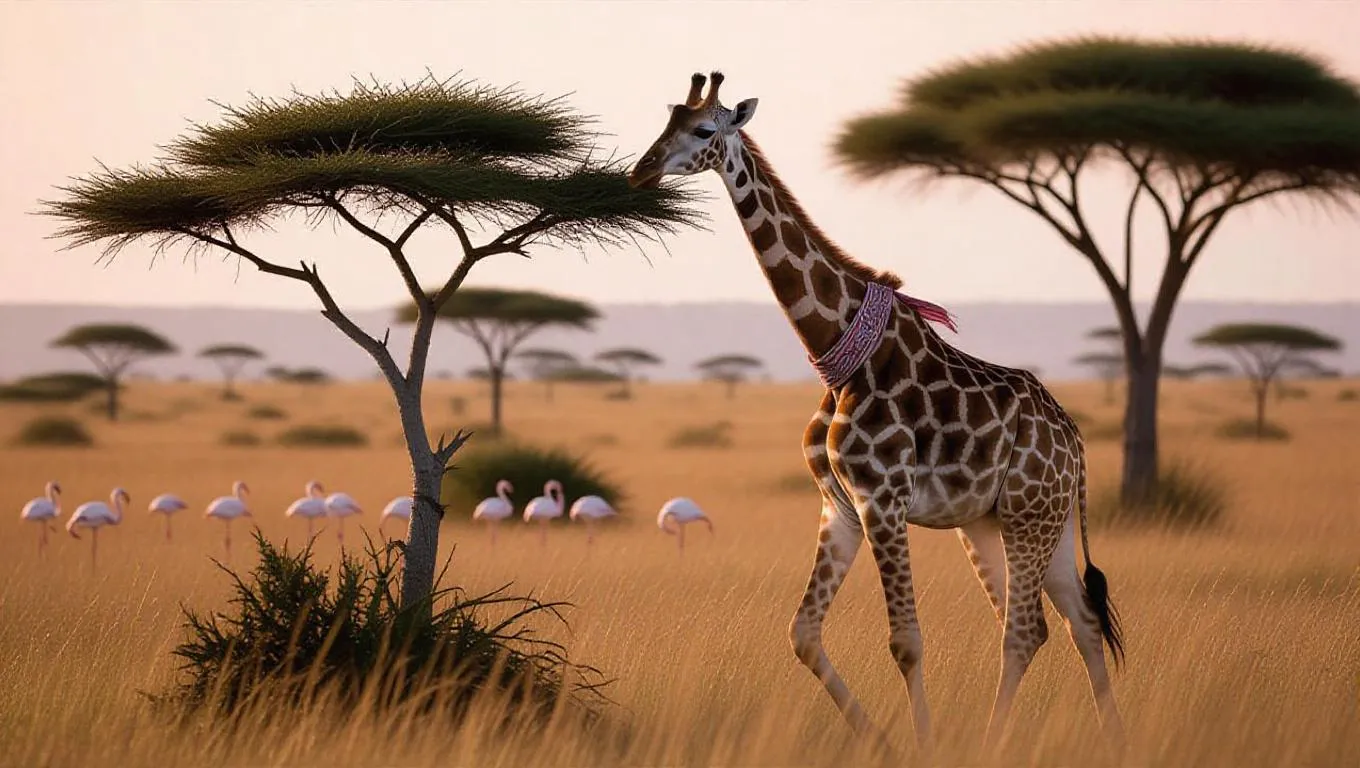 An inquisitive giraffe meanders through the vast plains of the Serengeti, Tanzania, its long neck stretching towards the buds of an ash tree. Dressed in a stylish scarf and cap, the giraffe's curious eyes sweep across the horizon. Surrounding it are swathes of tall grass and a few lone trees, their silhouettes painted in the soft light of sunset. In the distance, a small group of flamingos grazes gracefully, adding a splash of color to the scene. The atmosphere is serene, rich with the scent of warm soil and wildlife.