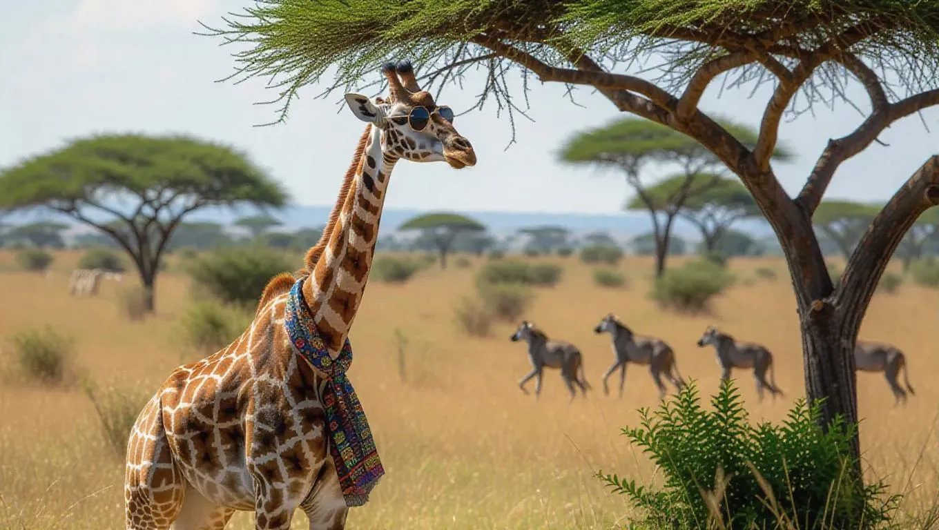A whimsical giraffe ambles through the open terrain of the Serengeti, Tanzania, its long neck reaching out towards the fresh leaves of an acacia tree. It boasts a fun patterned scarf and round sunglasses, looking attentively at its surroundings. Nearby, clusters of tall grasses and scattered trees enhance the picturesque scene, their shapes illuminated under the bright sun. In the distance, a troop of baboons plays energetically, their playful chatter echoing through the plains. The atmosphere is lively, infused with the aroma of wet earth and vegetation.