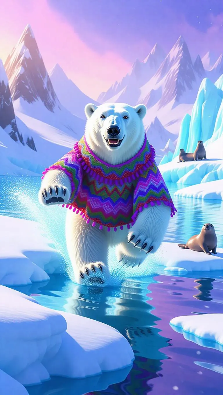A playful polar bear speeds down a snowy hill in the Arctic, its bright fur blending seamlessly with the icy terrain. The bear sports a colorful poncho and gloves, its movements clumsy yet charmingly fun. Surrounding it are frozen peaks and crystal-clear waters, glinting beautifully in the sunlight. In the far corner, a small group of seals enjoys basking on the ice, their cheerful sounds echoing around. The sky radiates hues of lavender and baby blue, forming a whimsical atmosphere.