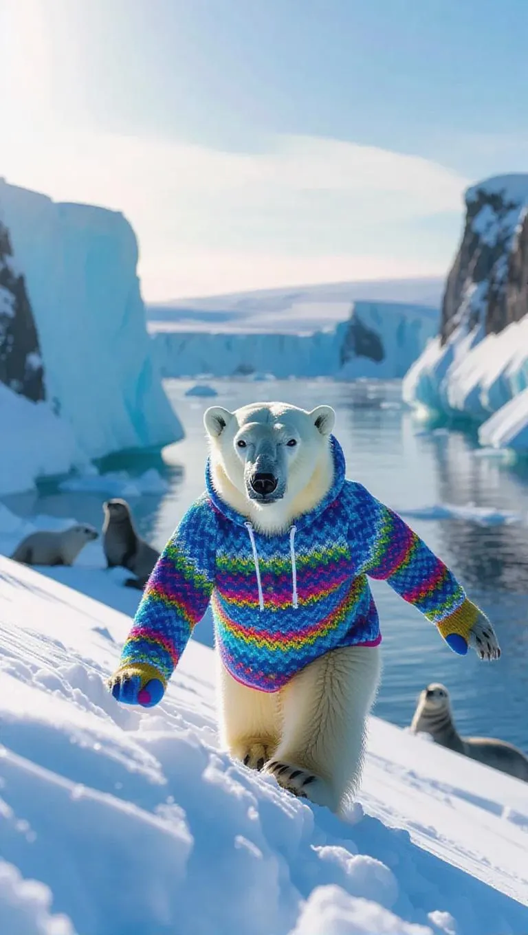 An energetic polar bear shuffles down a snowy slope in the Arctic, its light fur blending harmoniously with the snowy terrain. Adorned in a cool hoodie and colorful mittens, its movements are charmingly awkward. Encircling it are towering icy cliffs and shimmering glacial waters, their surfaces reflecting the sunlight magnificently. In the distance, seals relax on the ice, their sounds thriving in the crisp air. The sky is a stunning sight, with colors transitioning from blue to golden yellow at sunset.