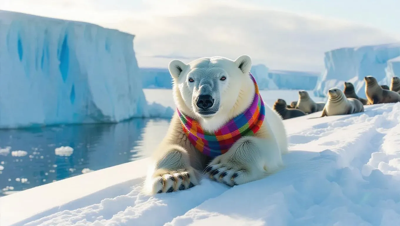 A playful polar bear rolls down a snowy slope in the Arctic, its thick white fur blending gently with the snowy environment. This bear sports a colorful scarf and adorable mittens, its cute but clumsy movements charming everyone around. Surrounding it, immortal icy cliffs and tranquil waters stretch far and wide, glimmering softly under the sunlight. In the background, a gathering of seals sunbathe on the ice, their playful interactions filling the chilled air. The sky is a canvas painted with shades of warm gold and cool blue, creating a whimsical backdrop.