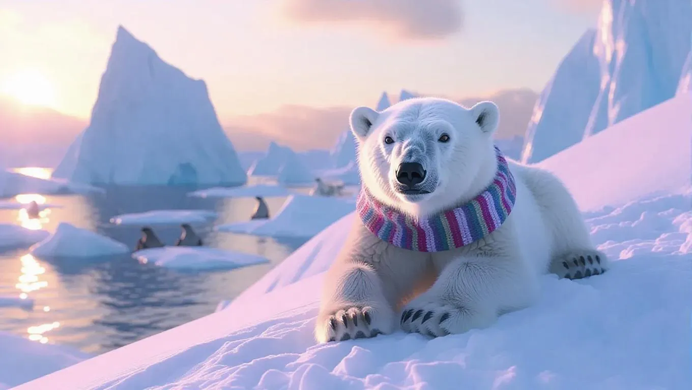 A cute polar bear slides down a snowy slope in the Arctic, its deep white fur harmonizing perfectly with the blanket of snow. It dons a striped scarf and a pair of mittens, its motions adorably awkward. Nearby, high ice mountains and frozen waters extend into the horizon, their surfaces sparkling under the golden sun. In the distance, seals rest on the ice, their happy barks echoing through the frosty atmosphere. The sky is wrapped in soft shades of pink and white, creating a dreamlike backdrop.