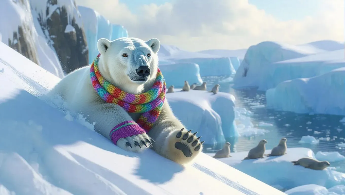 A whimsical polar bear slides effortlessly down a snowy slope in the Arctic, its snowy coat camouflaged within the drifts. Decked out in a colorful scarf and matching gloves, its delightful but clumsy motions are sure to warm hearts. The landscape includes frozen cliffs and bright waters stretching into the distance, sparkling in the sunlight. Nearby, seals lounge upon the ice, their joyful barks resounding through the air. The sky is alive with shades of coral and blue, creating a stupefying backdrop.
