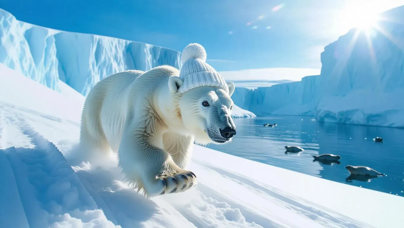 An adventurous polar bear races down a snowy hill in the Arctic, its fluffy coat melding with the snowy landscape. The bear wears a playful hat and mittens, its movements silly yet captivating. Around it, majestic icy cliffs and clear blue waters sprawled far and wide, sparkling under the sun. In the background, a small group of seals enjoys the ice, their calls echoing in the freeze. The sky is showcased in brilliant shades of azure and white, forming an alluring view.