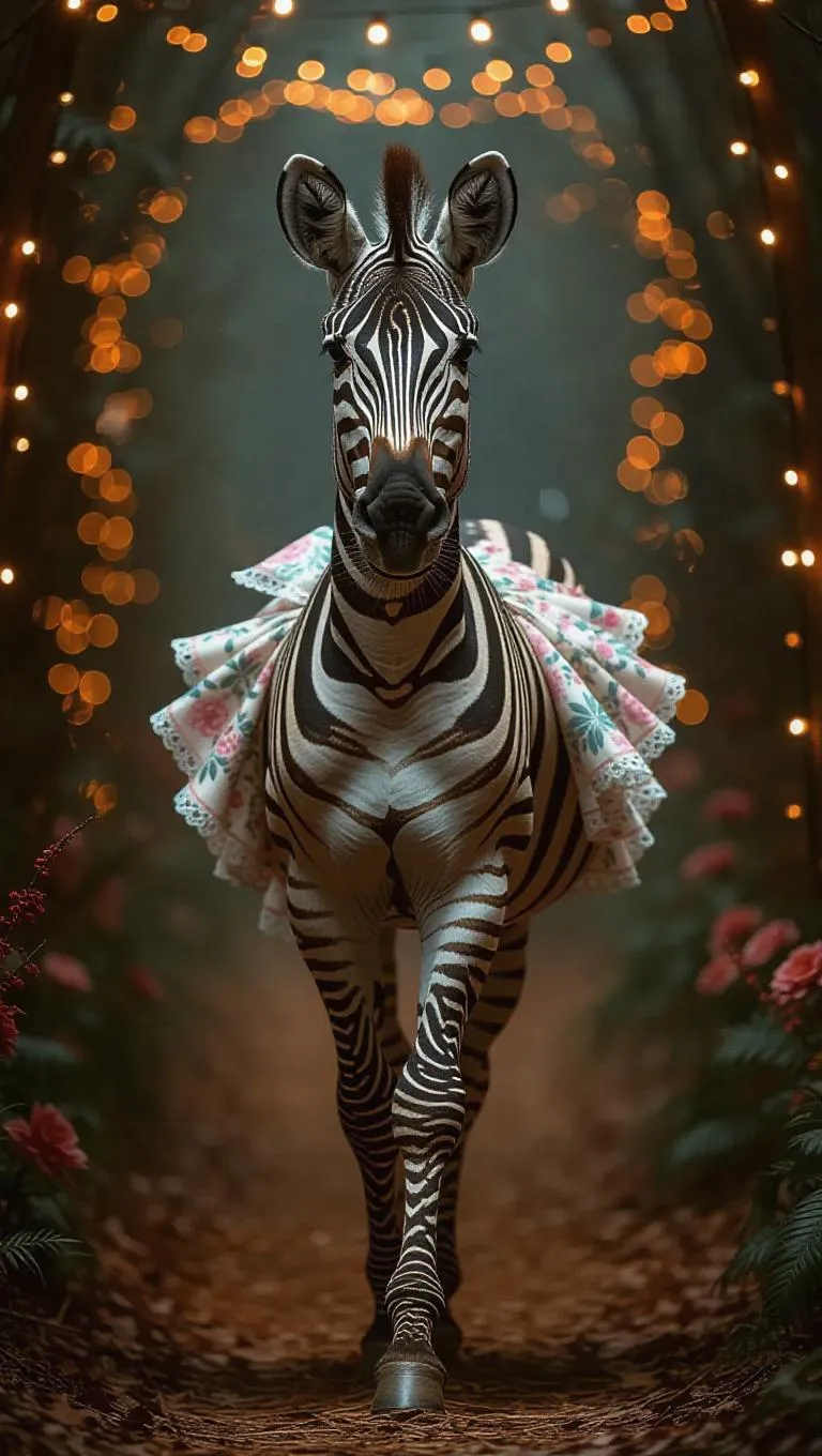 An elegant zebra glides down the runway with a regal posture. It wears an intricate floral-patterned gown with a delicate lace bow tie. The environment is an enchanting forest filled with fairy lights and whimsical creatures.