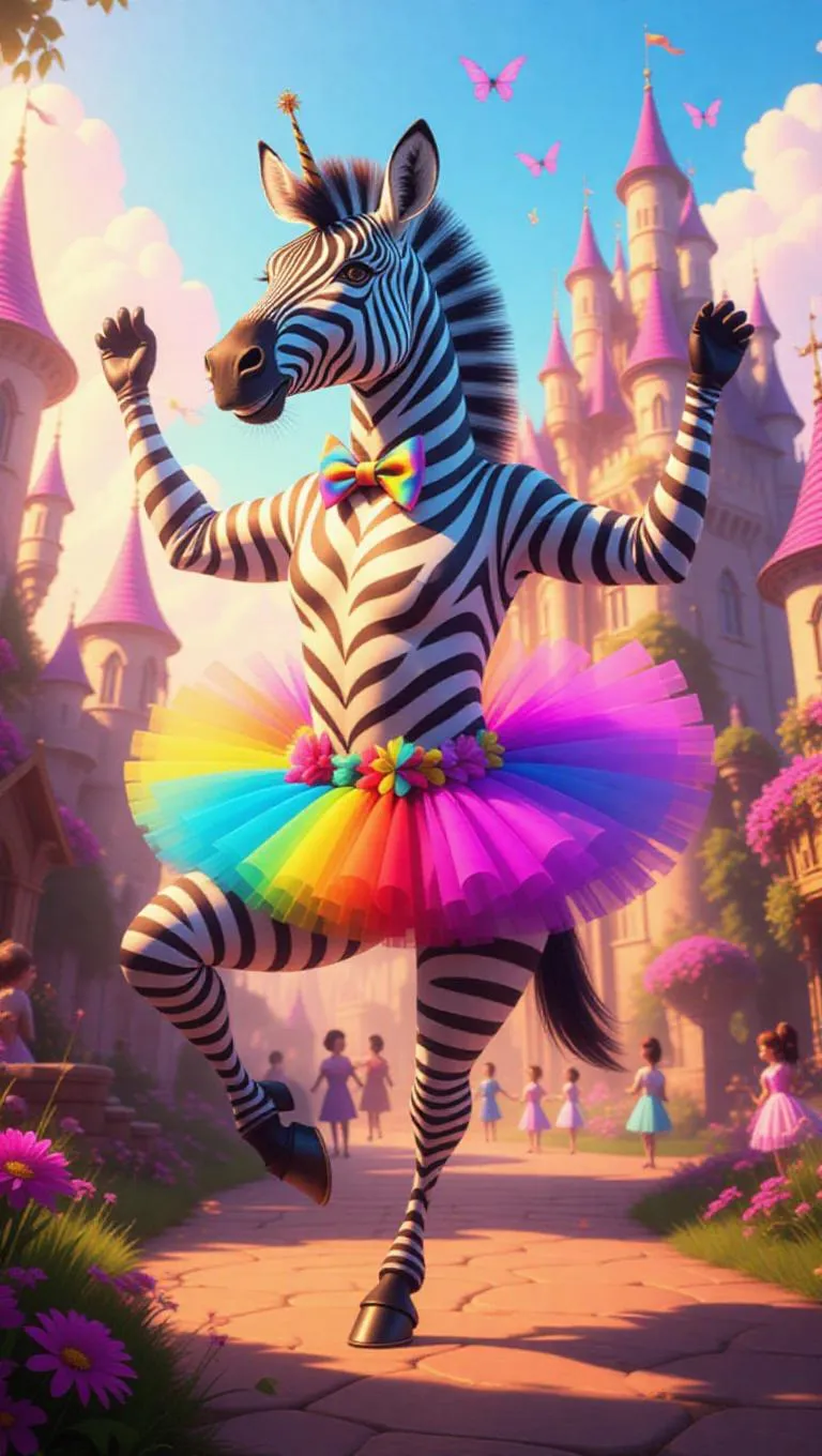 A whimsical zebra dances on the runway with playful movements. It is decked out in a rainbow-colored tutu and a whimsical bow tie. The background illustrates a magical castle with fairy tale characters frolicking around.