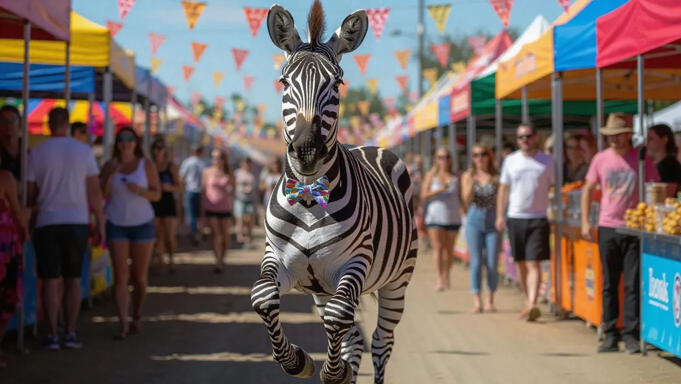 A quirky zebra hops down the runway with infectious enthusiasm. It dons a patchwork outfit made of various fabrics and a comical oversized bow tie. The setting is a vibrant street fair filled with food stalls and games.