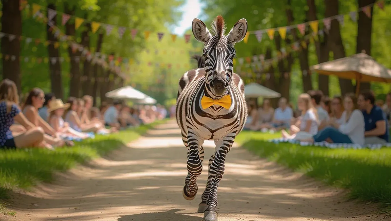 A playful zebra skips along the runway with a cheerful spirit. It wears a fun polka dot dress coupled with a bright yellow bow tie. The scene captures a sunny picnic in a park with families enjoying their day.